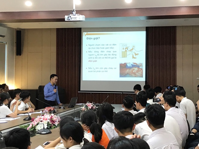Nằm trong chuyên đề 2 của buổi học tập trải nghiệm, bên cạnh những giờ học thực hành đầy lôi cuốn, các khái niệm về “điện trở”, “điện giật”,... đều được các Giảng viên Trường Đại học Công nghiệp Hà Nội phổ biến đến các bạn học sinh. Những biện pháp an toàn khi sử dụng điện và những cách xử lí khi bị điện giật cũng được các thầy, cô hướng dẫn và giúp học sinh tìm hiểu một cách kĩ lưỡng.