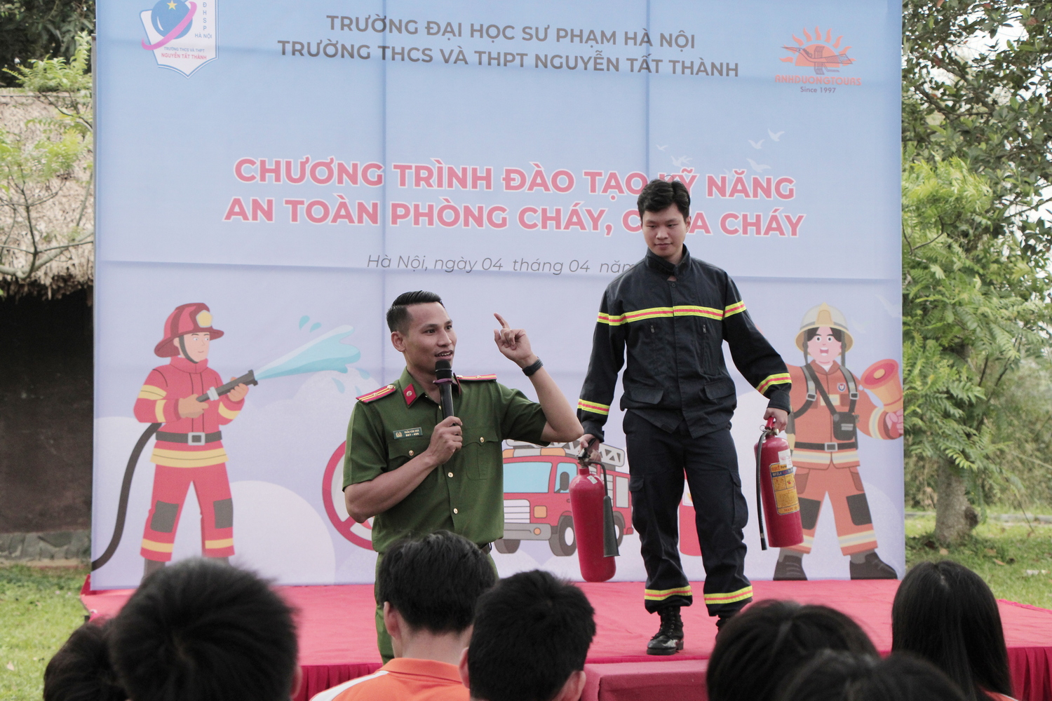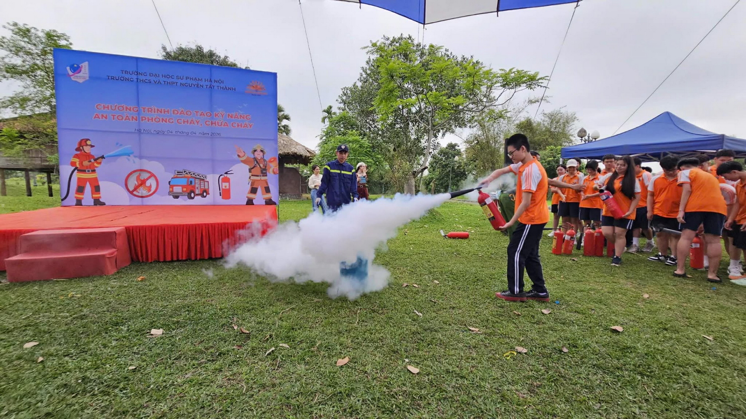 Học sinh trực tiếp thực hành sử dụng bình chữa cháy, rèn luyện kĩ năng xử lí tình huống khẩn cấp