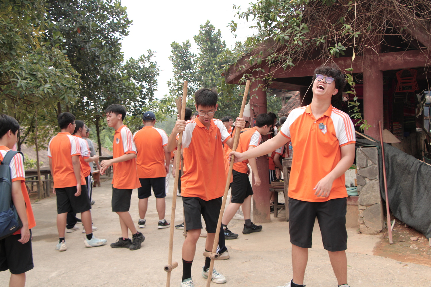 Bên cạnh đó, học sinh cũng được tham gia các hoạt động team-building tại sân cỏ với chuỗi trò chơi dân gian sôi nổi như đi cà kheo, nhảy bao bố, đua guốc, bước chân thần tốc. Mỗi thử thách không chỉ đòi hỏi sự nhanh nhẹn, khéo léo mà còn yêu cầu tinh thần phối hợp nhịp nhàng giữa các thành viên trong đội. Qua từng trò chơi, học sinh được rèn luyện thể lực, sự dẻo dai, đồng thời thêm gắn kết, hỗ trợ và tin tưởng lẫn nhau để cùng hướng tới mục tiêu chung. Những trò chơi dân gian quen thuộc, giản dị đã trở thành cầu nối giúp học sinh tiếp cận gần hơn với văn hóa truyền thống, từ đó nuôi dưỡng niềm tự hào về những giá trị đã được gìn giữ qua nhiều thế hệ. Kết thúc phần thi, lớp 10A4 xuất sắc giành giải Đặc biệt, giải Nhất thuộc về lớp 10A3, giải Nhì được trao cho lớp 10A5 và giải Ba dành cho lớp 10A6.