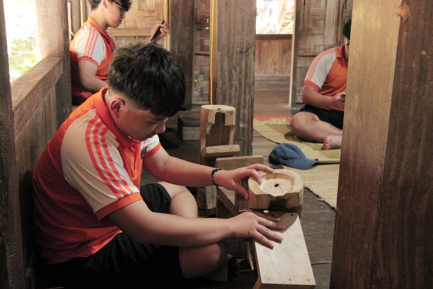 Tiếp đó, học sinh các lớp chia nhóm tham quan các khu làng dân tộc, tìm hiểu về kiến trúc nhà ở, trang phục, phong tục tập quán và những nét văn hóa đặc trưng của từng vùng miền. Đặc biệt, nhiều bạn còn được trực tiếp tham gia chế biến các món ăn truyền thống như xôi tím của người Khơ Mú, bánh Uôi của người Mường hay bánh chưng của người Lào. Những trải nghiệm này không chỉ mang lại sự hứng thú mà còn giúp học sinh hiểu rằng văn hóa được tạo nên từ chính đời sống thường nhật, từ những điều giản dị nhưng giàu ý nghĩa trong mỗi cộng đồng dân tộc. Qua đó, niềm tự hào về sự đa dạng và phong phú của văn hóa Việt Nam cũng được nuôi dưỡng một cách tự nhiên và sâu sắc.