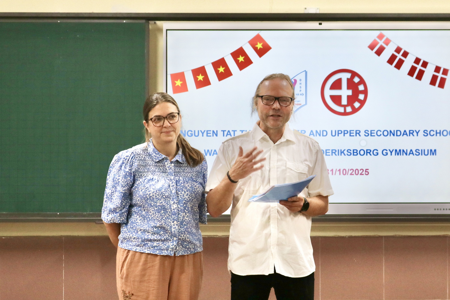Chiều thứ Năm (23/10/2025), Trường THCS và THPT Nguyễn Tất Thành vinh dự đón tiếp đoàn giáo viên và học sinh đến từ Trường Frederiksborg Gymnasium (Đan Mạch) trong khuôn khổ chương trình giao lưu, học tập và trao đổi kinh nghiệm quốc tế. Chuyến thăm đánh dấu một bước tiến quan trọng trong hành trình hợp tác giáo dục giữa hai ngôi trường, đồng thời mở ra cơ hội để học sinh Việt Nam và Đan Mạch thêm hiểu biết, gắn bó và cùng nhau lan tỏa tinh thần học hỏi.