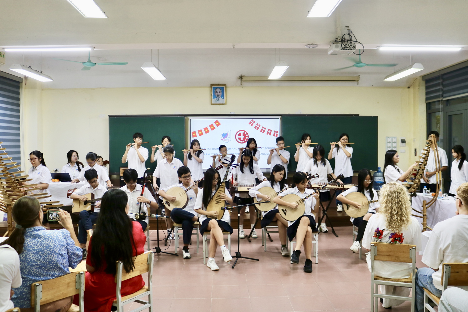 Không khí buổi giao lưu trở nên sôi động và đầy cảm xúc với những tiết mục biểu diễn đặc sắc do câu lạc bộ Nhạc cụ dân tộc (TMIC) thể hiện. Nếu “Đi cấy” gợi lên khung cảnh làng quê thanh bình, nơi người nông dân Việt Nam cần cù, gắn bó với đất đai, thì “Hào khí Việt Nam” lại vang lên rộn rã niềm tin và ý chí quật cường của con người Việt Nam trong hành trình dựng nước và giữ nước.