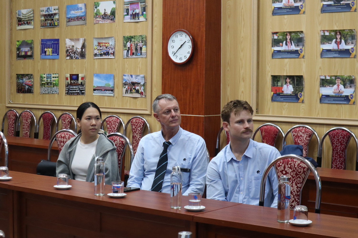 Đoàn giảng viên và giáo sinh Trường Đại học Newcastle (Australia) chăm chú lắng nghe phần giới thiệu về Trường THCS và THPT Nguyễn Tất Thành