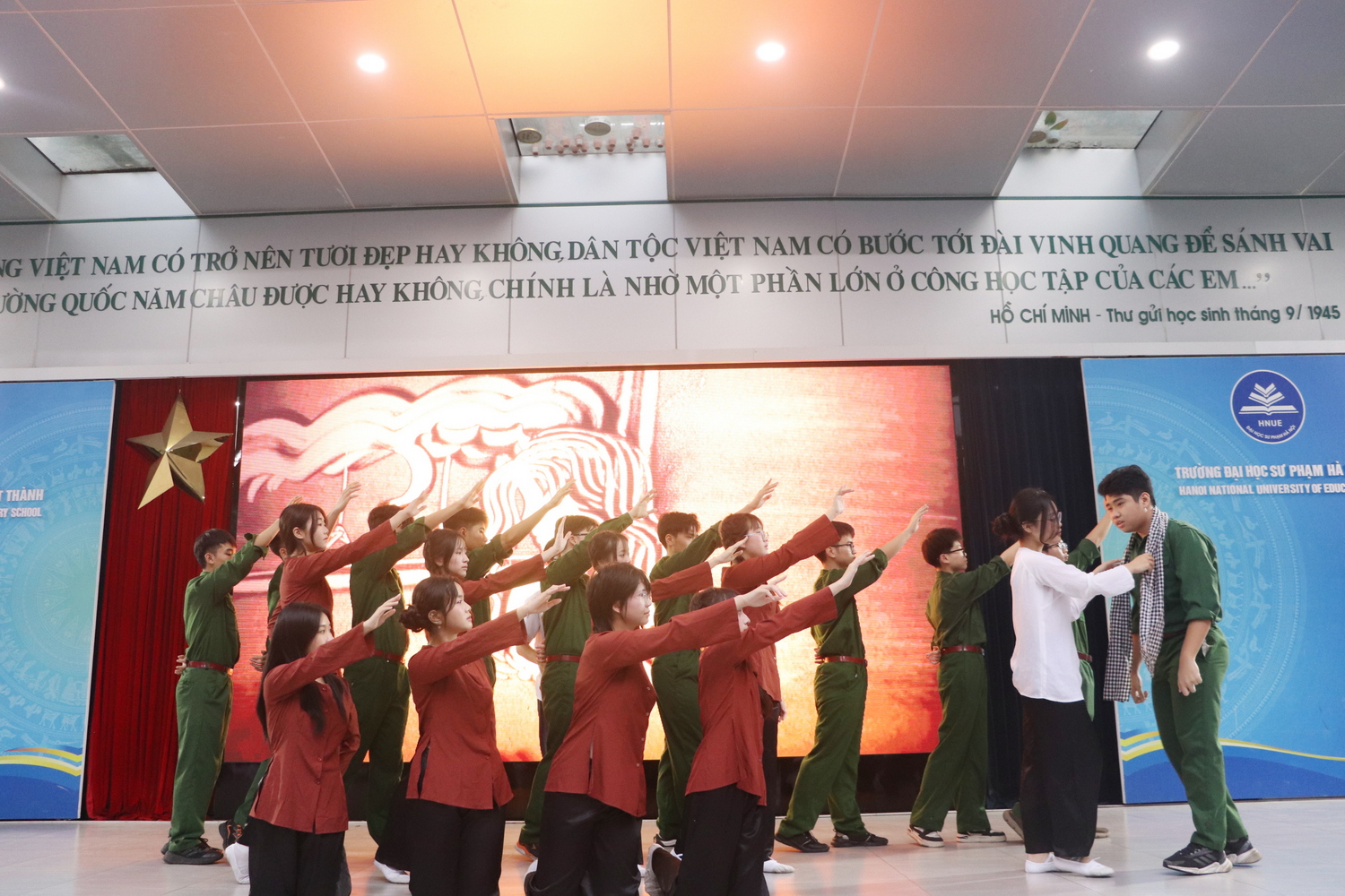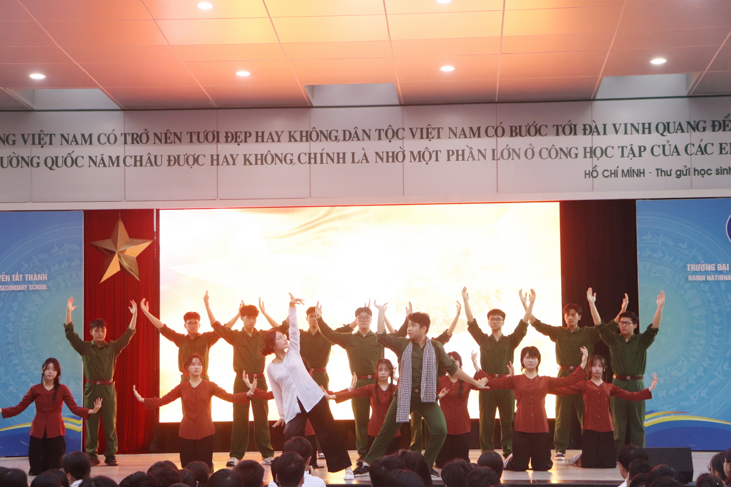 Bên cạnh sự lắng đọng, không khí buổi sinh hoạt còn trở nên sôi nổi với tiết mục nhảy “Kiếp sau vẫn là người Việt Nam” do tập thể lớp 12A1 biểu diễn. Màn trình diễn mạnh mẽ, giàu năng lượng đã tái hiện tinh thần quật cường, bất khuất của dân tộc Việt Nam trong những năm tháng chiến đấu gian khổ. Tiết mục không chỉ mang đến sự cuốn hút cho người xem mà còn góp phần thể hiện niềm tự hào dân tộc, khơi dậy tình yêu quê hương, đất nước trong mỗi học sinh.