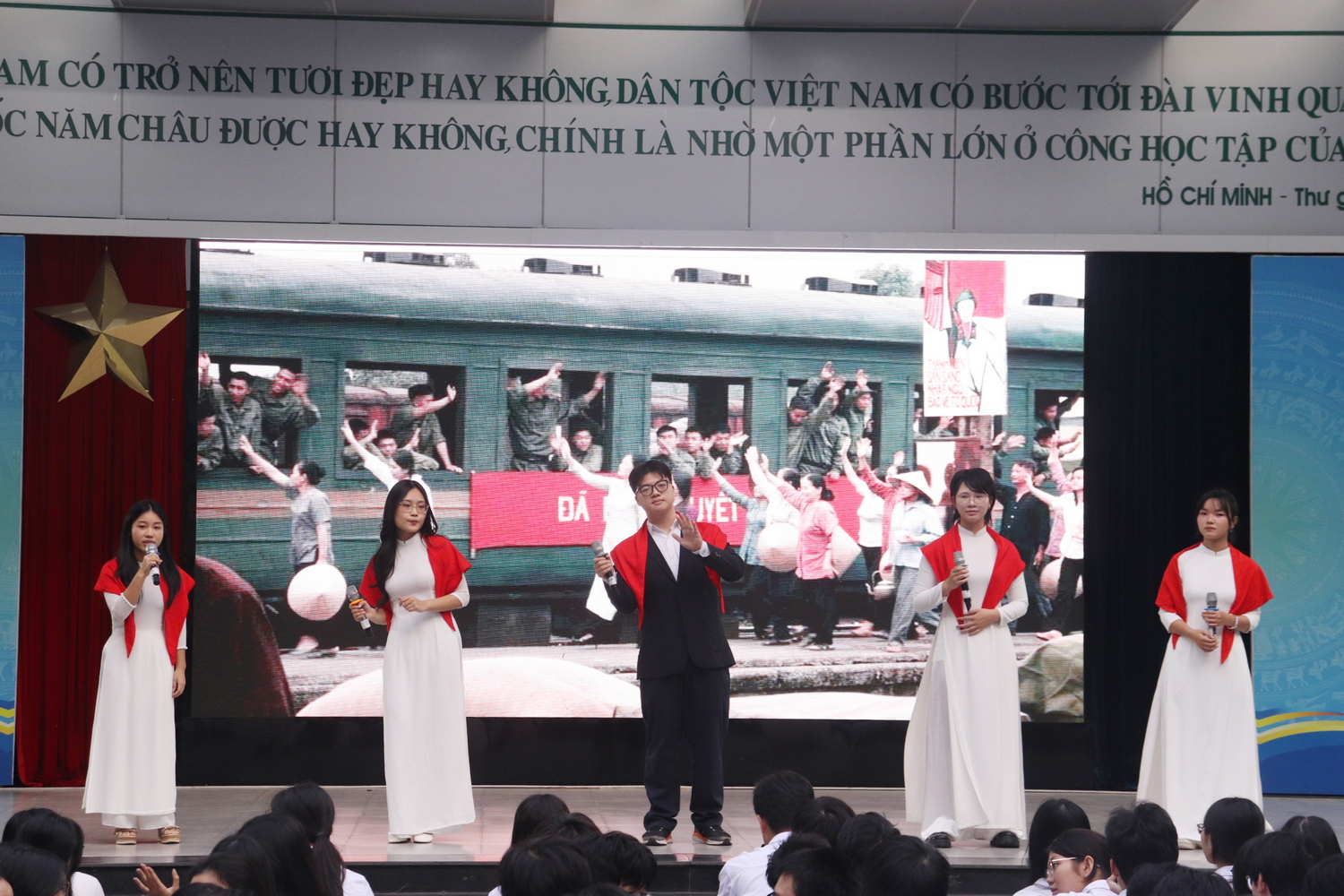 Tiết mục của tập thể lớp 12D4 mang thông điệp về niềm tin và khát vọng dựng dây đất nước trong thời kì hội nhập