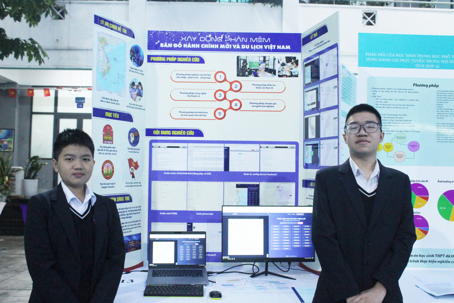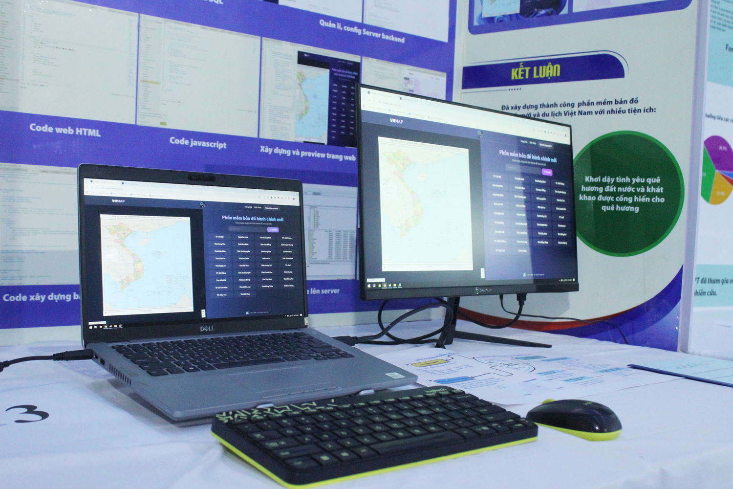 Học sinh Nguyễn Hải Long (8A6) và Vũ Nguyễn Quang Anh (8A5), học sinh trường THCS và THPT Nguyễn Tất Thành (Hà Nội), chủ nhân đề tài nghiên cứu “Xây dựng phần mềm bản đồ hành chính mới và du lịch Việt Nam” chia sẻ về lí do lựa chọn đề tài: “Ước mơ của chúng em là để tất cả mọi người có thể chiêm ngưỡng vẻ đẹp của đất nước Việt Nam một cách dễ dàng nhất. Từ đam mê đó, chúng em đã xây dựng nên một hệ thống có hỗ trợ 6 loại ngôn ngữ khác nhau và có thể thay đổi dữ liệu liên tục về các tỉnh thành tại Việt Nam.”