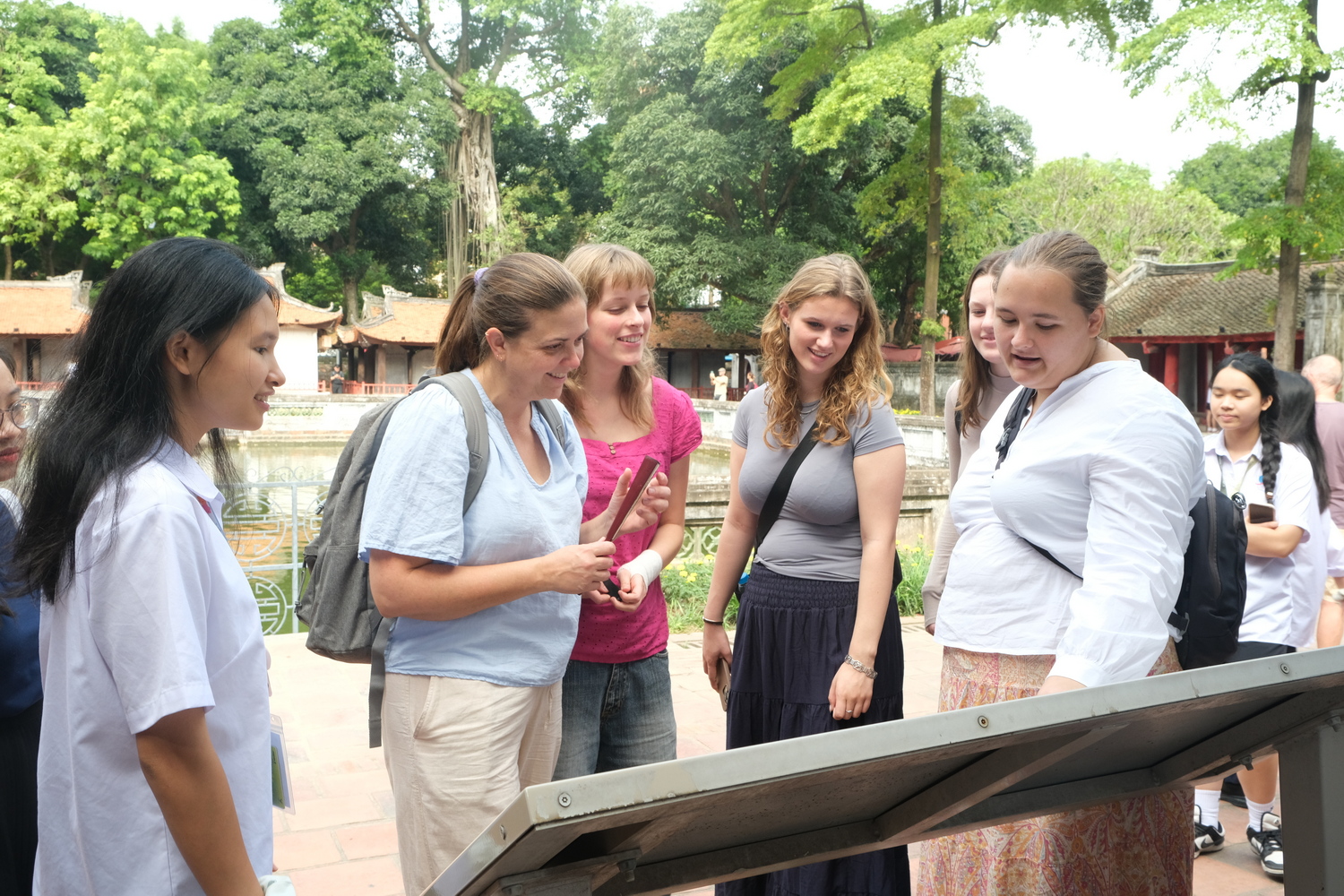 Buổi sáng, đoàn học sinh đến từ Đan Mạch đã có chuyến tham quan Văn Miếu - Quốc Tử Giám, ngôi trường đại học đầu tiên của Việt Nam. Không chỉ là nơi đào tạo hàng nghìn nhân tài, tiến sĩ cho đất nước, Văn Miếu - Quốc Tử Giám còn nổi bật với lối kiến trúc cổ kính, độc đáo và cảnh quan thiên nhiên yên bình.