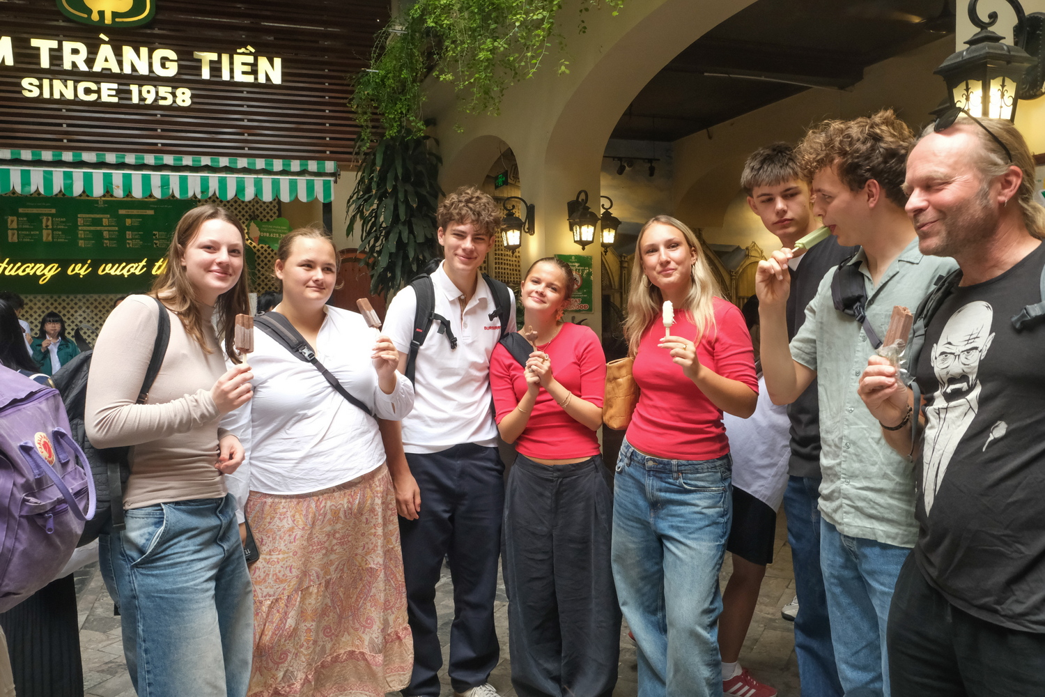 Đoàn học sinh Đan Mạch tận hưởng những que kem Tràng Tiền sau một buổi sáng tham quan và khám phá