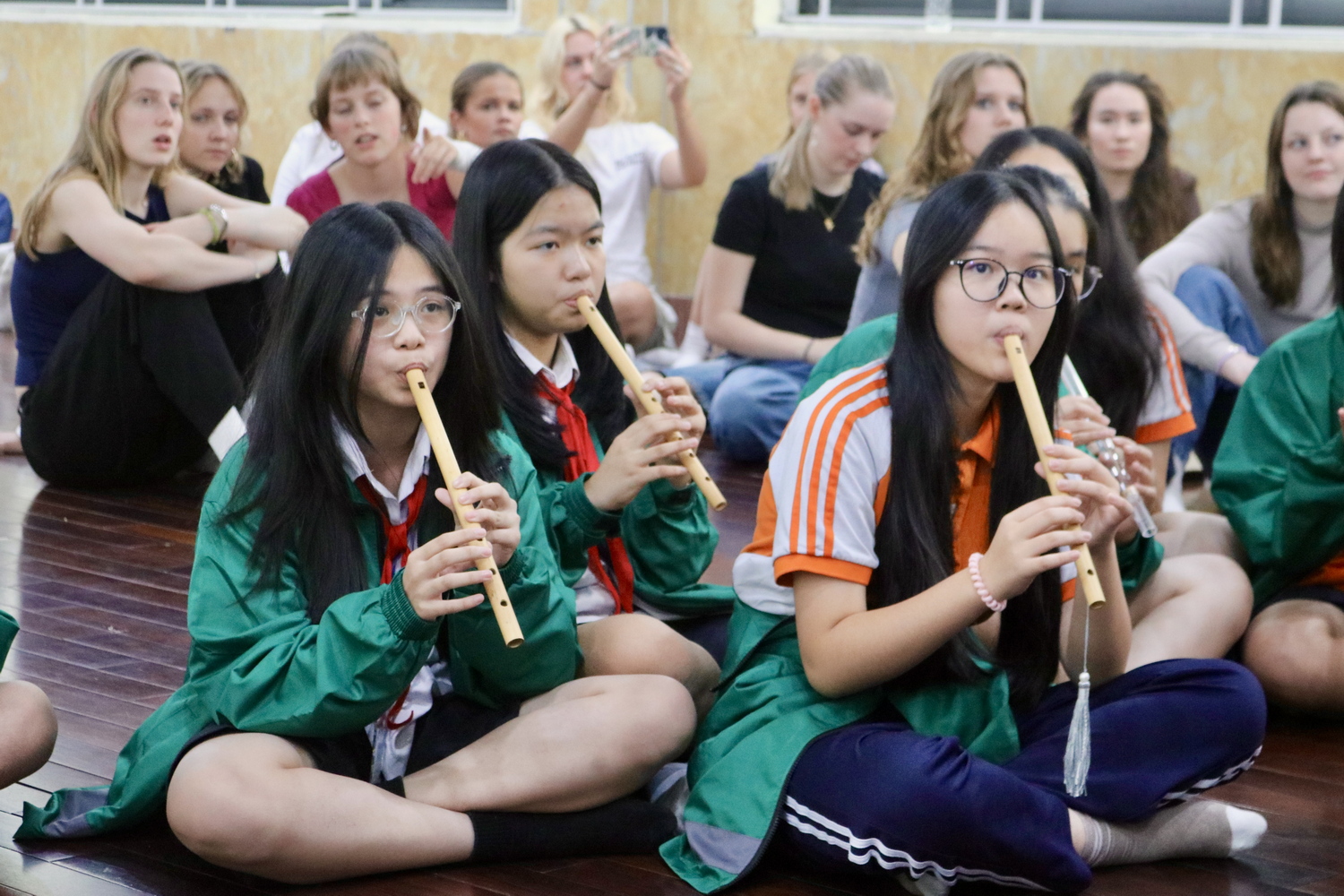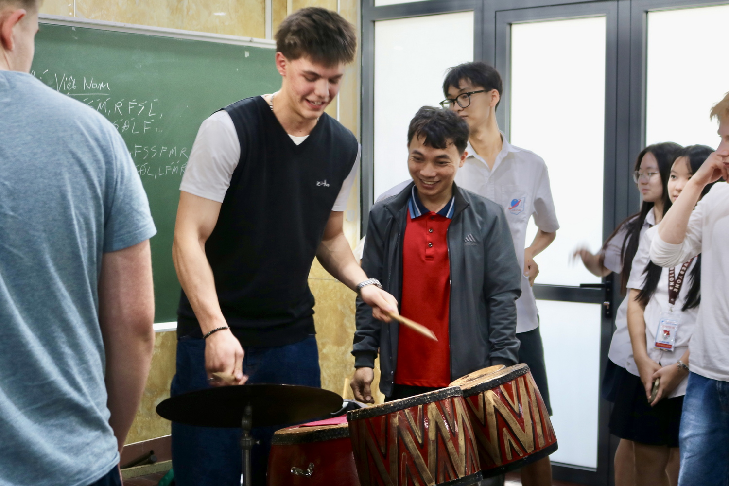 Không chỉ dừng lại ở việc thưởng thức, học sinh Đan Mạch còn được trực tiếp trải nghiệm những nhạc cụ dân tộc này. Dưới sự hướng dẫn tận tình của các thầy cô và học sinh trường Nguyễn Tất Thành, buổi giao lưu trở thành một hành trình khám phá văn hóa đầy sống động - nơi những âm sắc truyền thống của Việt Nam đáp lại sự tò mò, háo hức của bạn bè quốc tế.