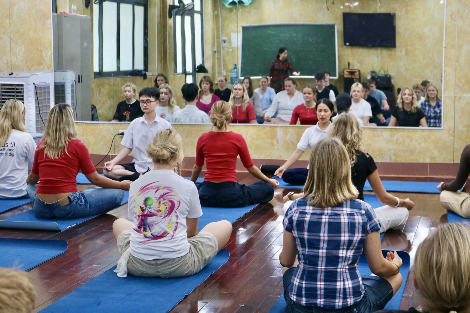 Sau giờ học nhạc cụ dân tộc vô cùng sôi động, học sinh Đan Mạch tiếp tục được tham gia một tiết học Yoga thú vị cùng cô giáo Vũ Thanh Mai.