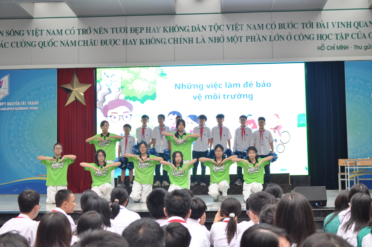 Bên cạnh đó, lấy bối cảnh ở chính nơi thân thuộc nhất với học sinh - mái trường THCS và THPT Nguyễn Tất Thành, vở kịch “Rác ơi về đúng chỗ” đầy hấp dẫn của lớp 7A2 đã để lại ấn tượng với khán giả của mái trường mang tên Bác với những tiếng cười giòn giã. Vở kịch đã miêu tả rõ nét vấn đề thường thấy ở lứa tuổi học sinh - xả rác bừa bãi, không đúng nơi quy định, từ đó truyền tải thông điệp ý nghĩa về việc bảo vệ môi trường học đường, giữ mái trường “sáng - xanh - sạch - đẹp” đến học sinh.
