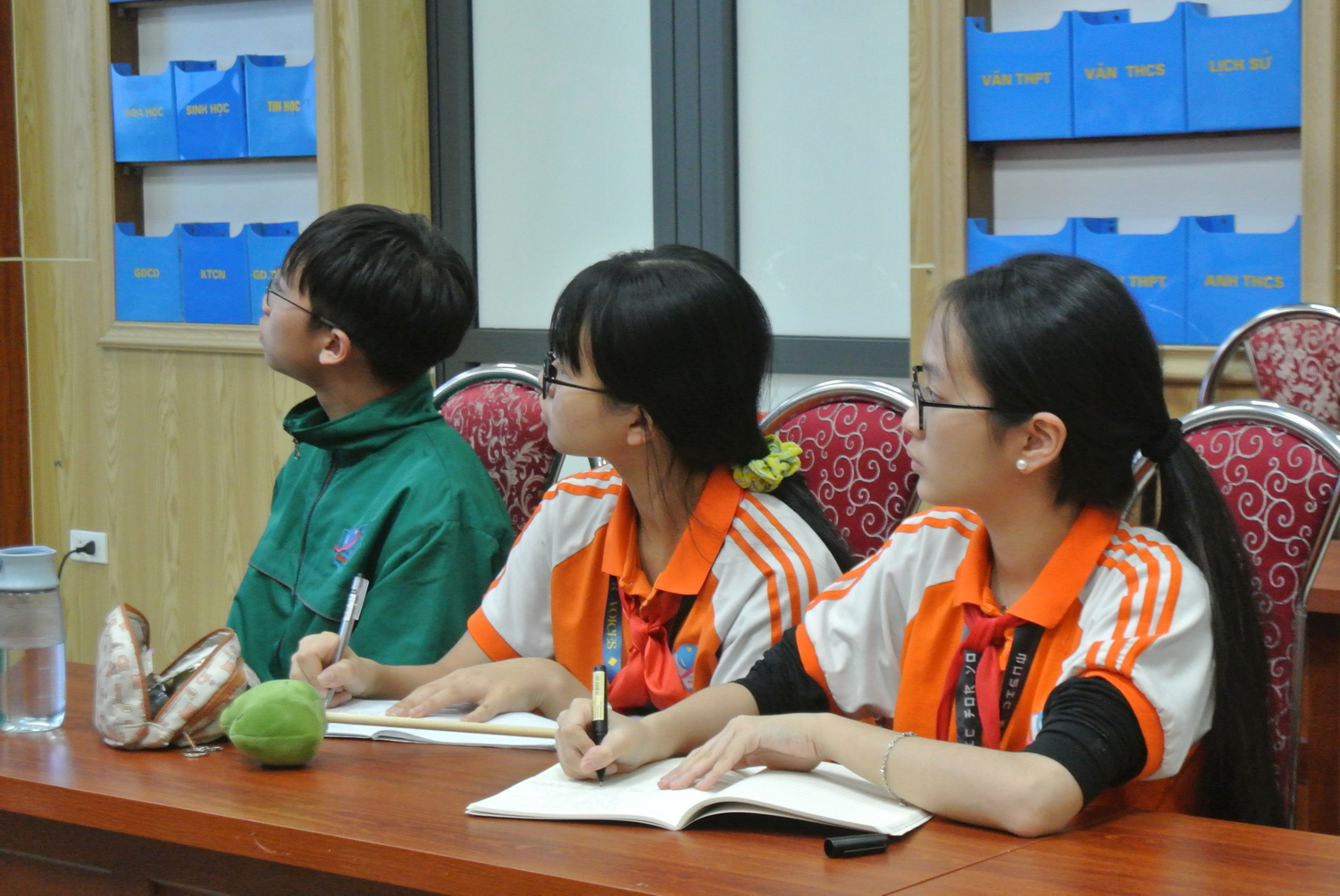Các bạn học sinh chăm chú lắng nghe hai cựu học sinh chia sẻ về kinh nghiệm, phương pháp học tiếng Anh