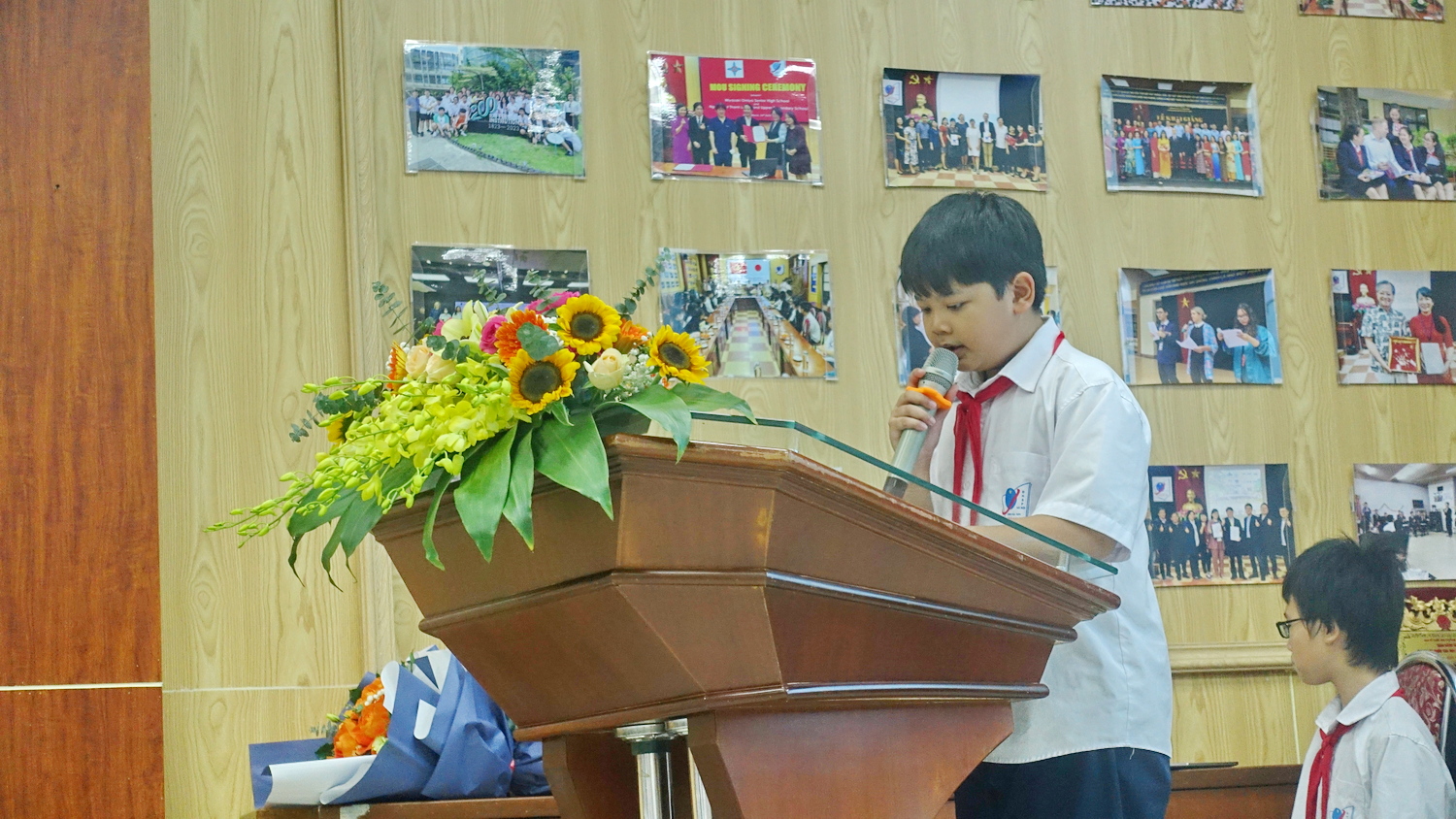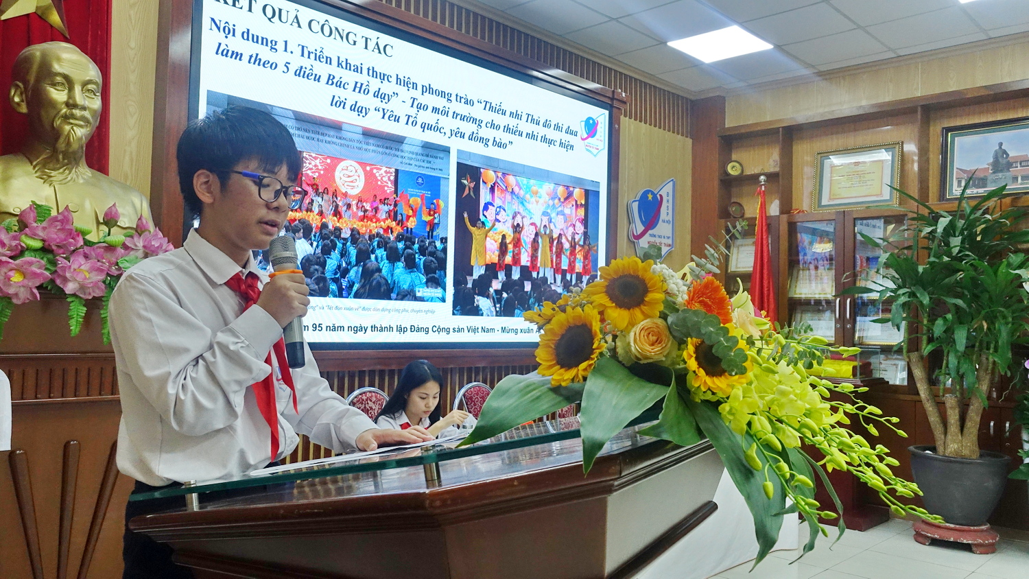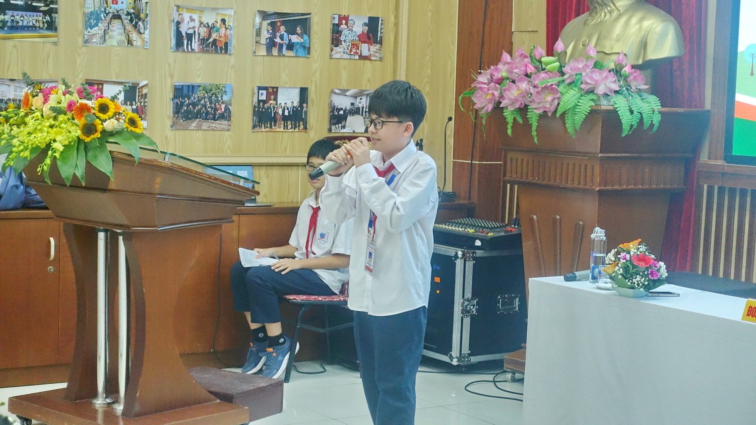 Đội viên Nguyễn Tùng Lâm - chi đội 9A2 đọc báo cáo tổng kết công tác Đội và phong trào thiếu nhi của Trường THCS và THPT Nguyễn Tất Thành năm học 2024-2025