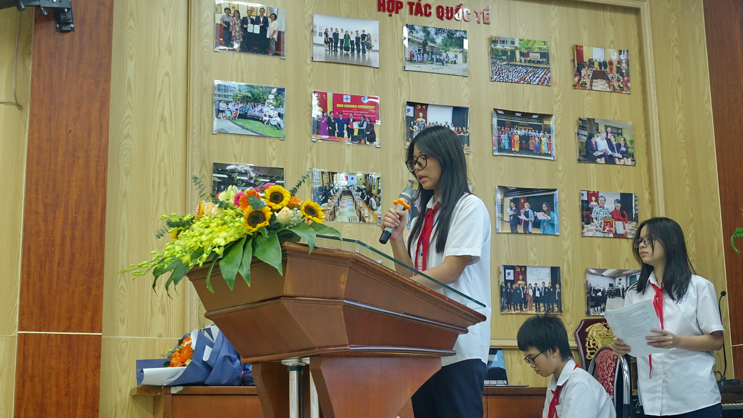 Đội viên Phạm Mỹ Hà - chi đội 9A4 với bản tham luận về nội dung “Quản lí cảm xúc”, nhấn mạnh vai trò nhận diện và điều tiết cảm xúc trong học đường