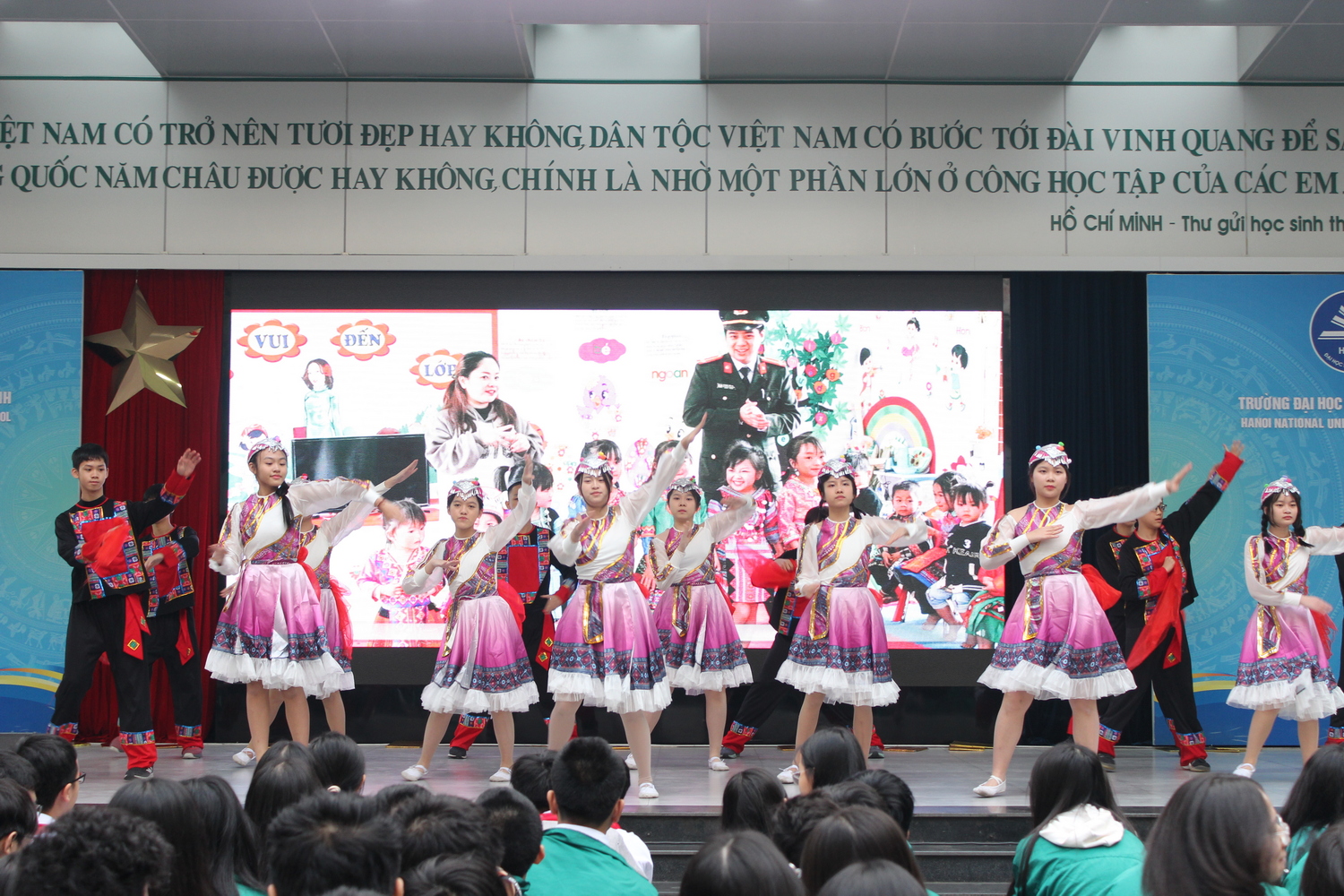Mở đầu cho những lời nhắn gửi về tình yêu thương chính là tiết mục “Hành trình của lá” do tập thể lớp 8A2 trình bày. Qua hình ảnh hai “chiếc lá” giữa rừng, ca khúc nhấn mạnh rằng mỗi người chúng ta đều có chung cội nguồn, quê hương, đều xứng đáng được bảo vệ, chở che và yêu thương. Tiết mục không chỉ đơn giản là kể lại câu chuyện của một chiếc lá bé nhỏ, mà qua hình ảnh gần gũi, giản dị ấy để đưa thông điệp về tình yêu thương, lòng nhân ái và sự sẻ chia tiếp cận gần hơn với học sinh.