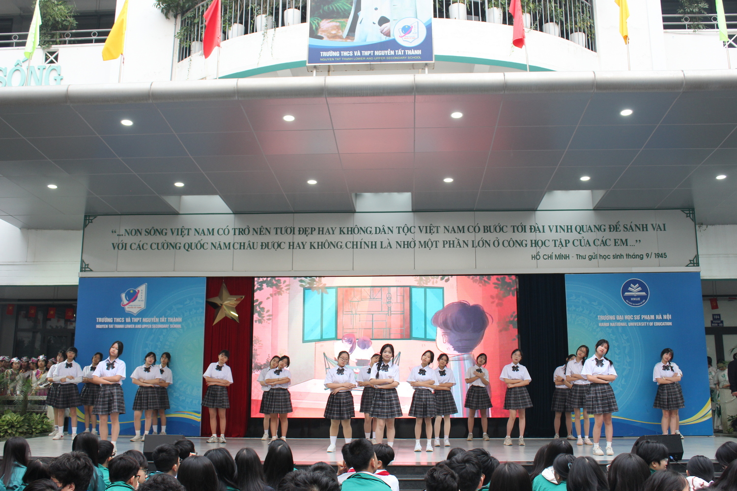 Trên hành trình trưởng thành và đi xa của con luôn có bóng dáng của người mẹ - nguồn động viên tinh thần lớn lao. Với thông điệp yêu thương ấy, tập thể lớp 8A5 đã khép lại chương trình sinh hoạt dưới cờ với tiết mục nhảy hiện đại “Lớn rồi còn khóc nhè”. Bằng nhịp điệu sôi động kết hợp với những ca từ giàu cảm xúc, tiết mục đã gửi gắm giá trị thiêng liêng của tình mẫu tử và lòng biết ơn trong cuộc sống.
