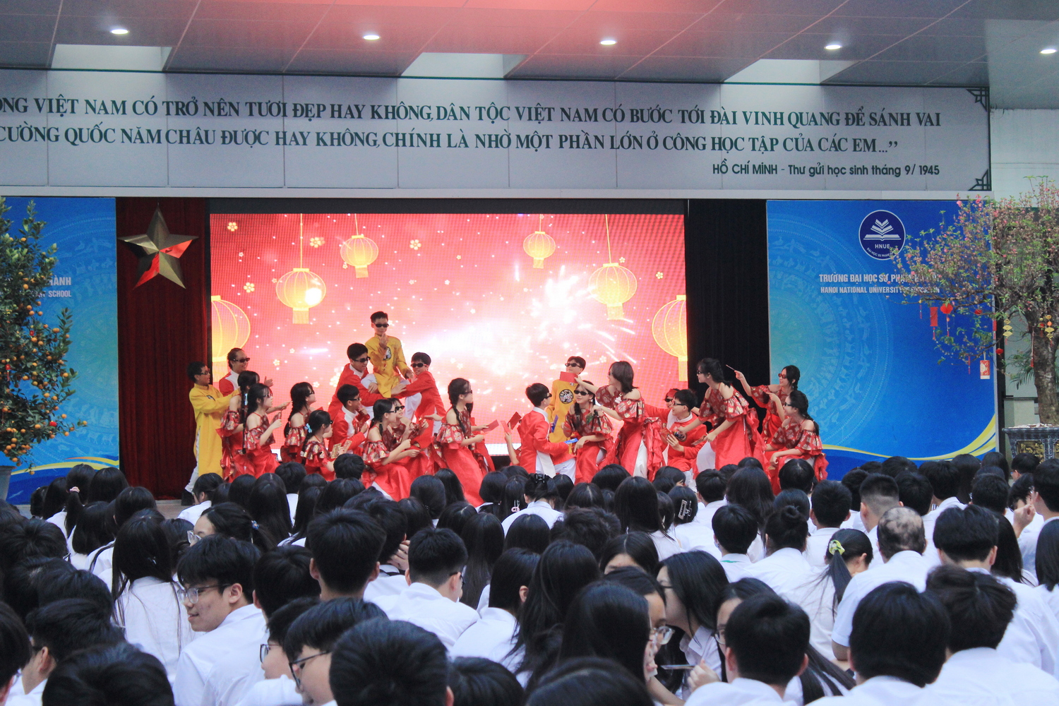 Tiết mục mashup “Như hoa mùa xuân” và “Đoản xuân ca” rực rỡ sắc màu, mang không khí xuân tươi vui lan tỏa khắp sân trường