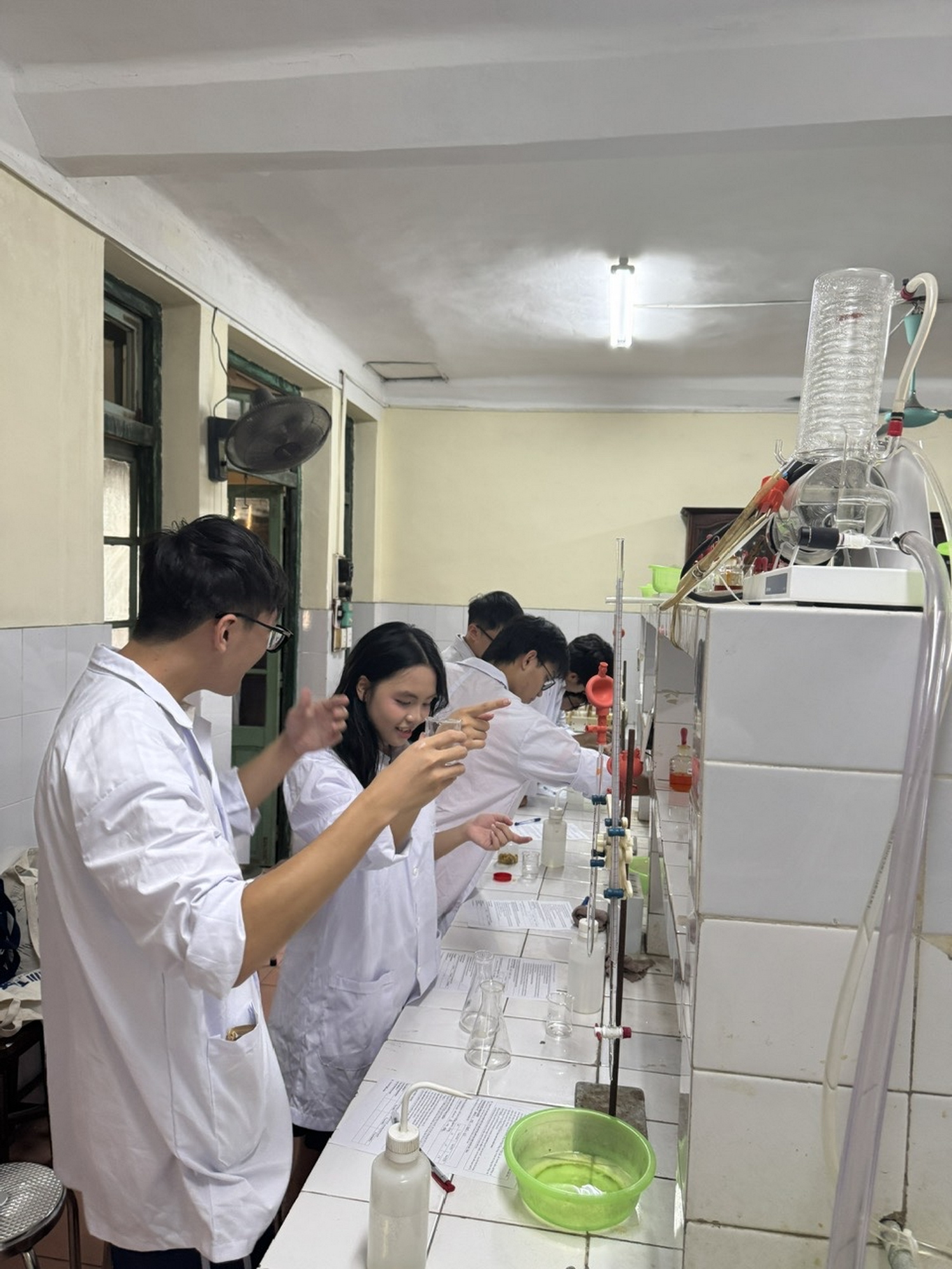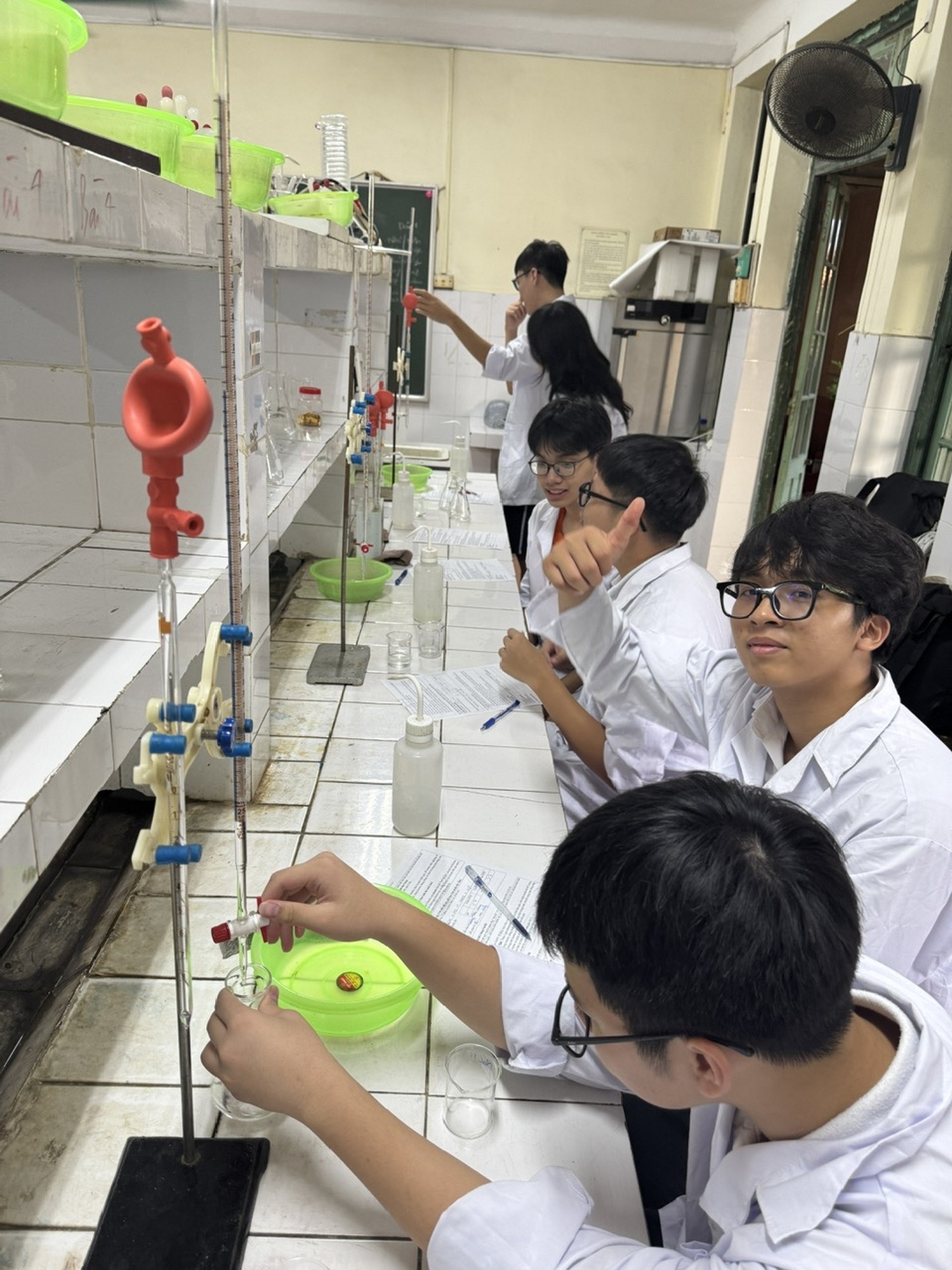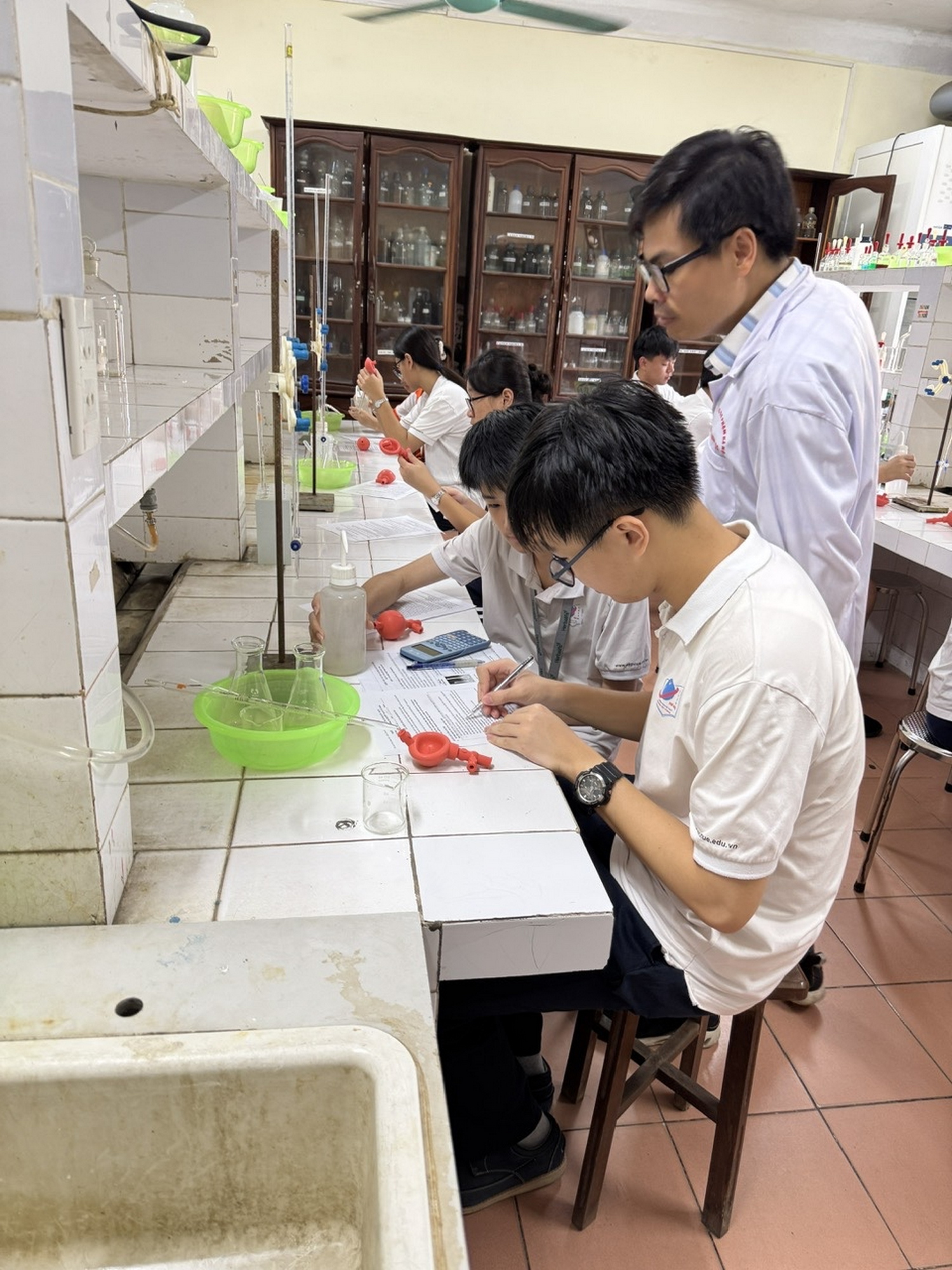 Dưới sự hướng dẫn tận tình của giảng viên và giáo viên bộ môn, học sinh được chia thành các nhóm nhỏ để trực tiếp thực hiện thí nghiệm chuẩn độ. Các em lần lượt tiến hành pha chế dung dịch, sử dụng burette, pipette, quan sát sự chuyển màu của chỉ thị phenolphthalein và methyl da cam, ghi nhận thể tích dung dịch tại điểm tương đương. Mỗi thao tác, từ việc điều chỉnh vòi nhỏ giọt cho tới việc đọc kết quả thể tích, đều rèn luyện sự cẩn thận, chính xác và tinh thần trách nhiệm. Hoạt động nhóm cũng giúp học sinh trau dồi kĩ năng hợp tác, lắng nghe và chia sẻ kinh nghiệm với bạn bè - những năng lực quan trọng trong học tập và nghiên cứu khoa học.