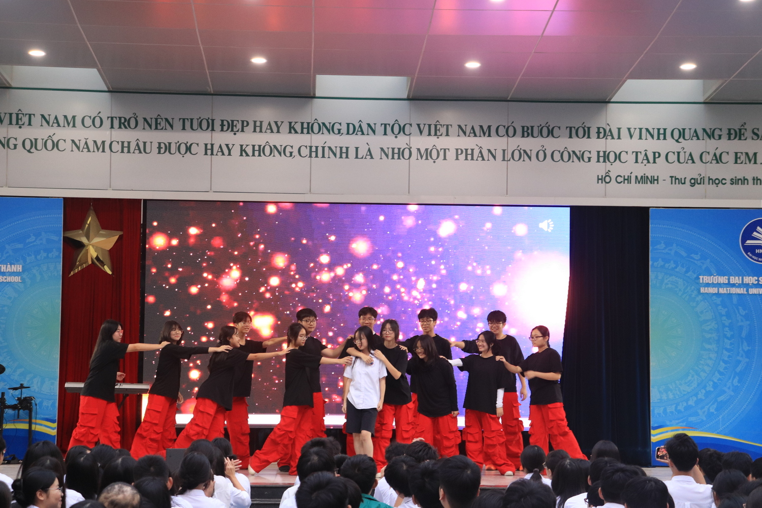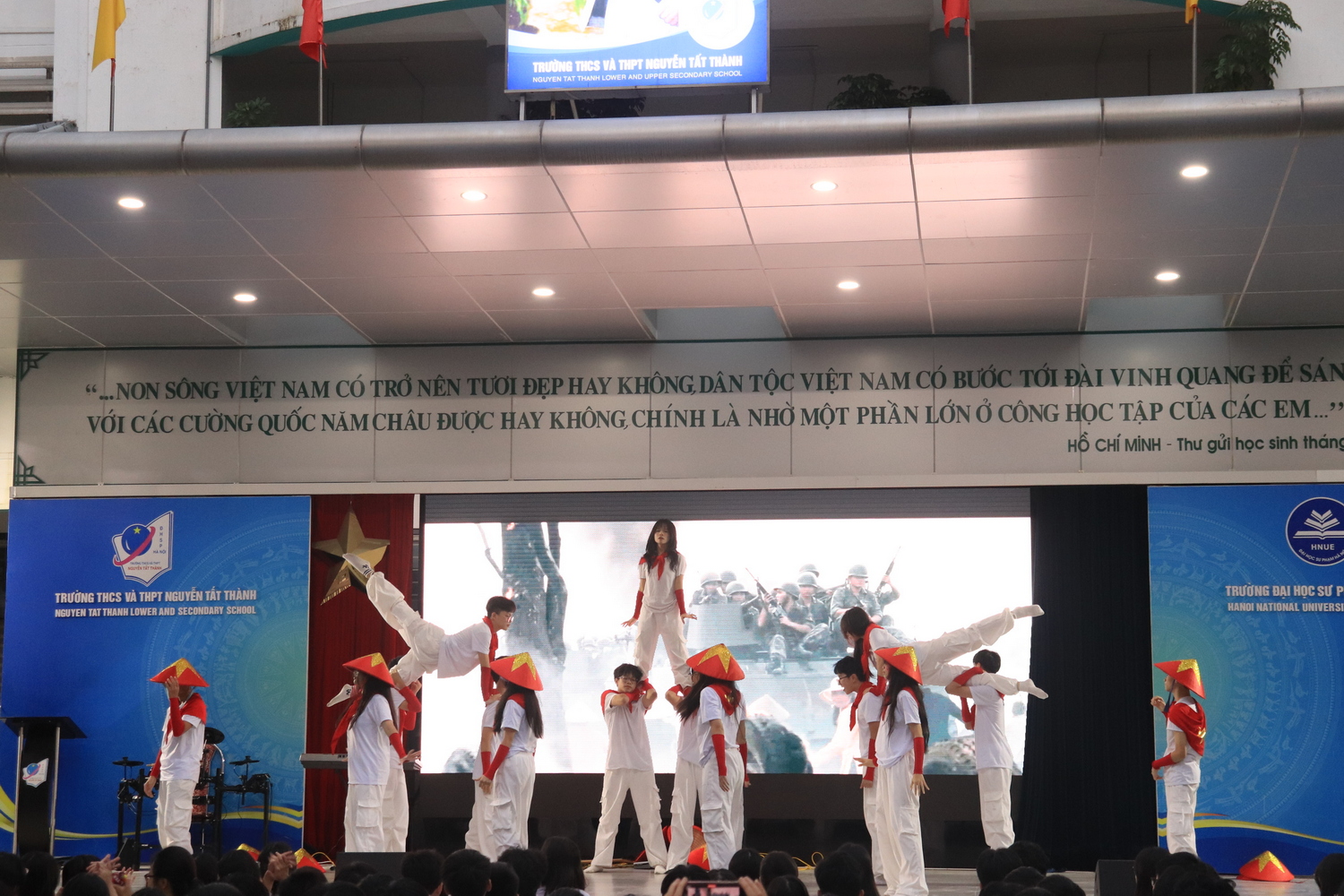 Tiết mục nhảy mashup “Tiến quân ca” - “Tự hào là người Việt Nam” - “Viết tiếp câu chuyện hòa bình” - “Đường lên phía trước” của học sinh lớp 9A3 đã khích lệ giới trẻ sống đoàn kết, sống đẹp và có ý nghĩa với cuộc đời