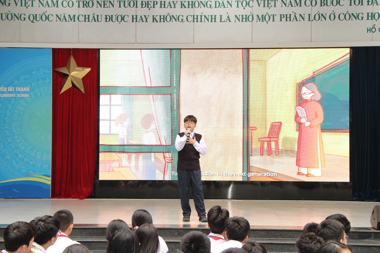 Qua hàng ngàn năm dựng nước và giữ nước, dân tộc Việt Nam ta luôn giữ vững tinh thần “tôn sư trọng đạo”. Công ơn của thầy cô được khắc sâu vào tiềm thức mỗi người con đất Việt như một lời căn dặn về tầm quan trọng của người thầy, cũng như tầm quan trọng của con chữ. Dù là thời chiến hay thời bình, người thầy vẫn đóng vai trò vô cùng quan trọng trong công cuộc “ươm mầm” thế hệ trẻ, góp phần xây dựng đất nước. Để tỏ lòng biết ơn, tri ân người thầy, đại diện học sinh toàn trường - bạn Nguyễn Ngọc Gia Hân (lớp 7A1) đã trao tặng thầy cô bó hoa tươi thắm và gửi lời chúc mừng nhân ngày Nhà giáo Việt Nam 20/11.