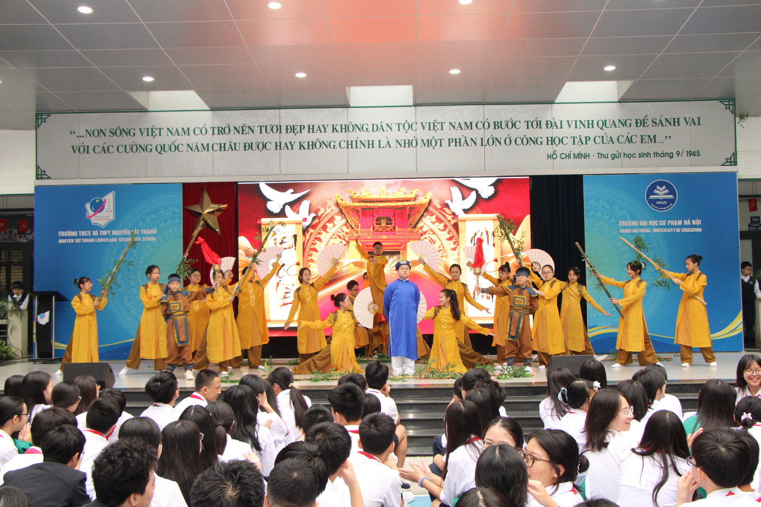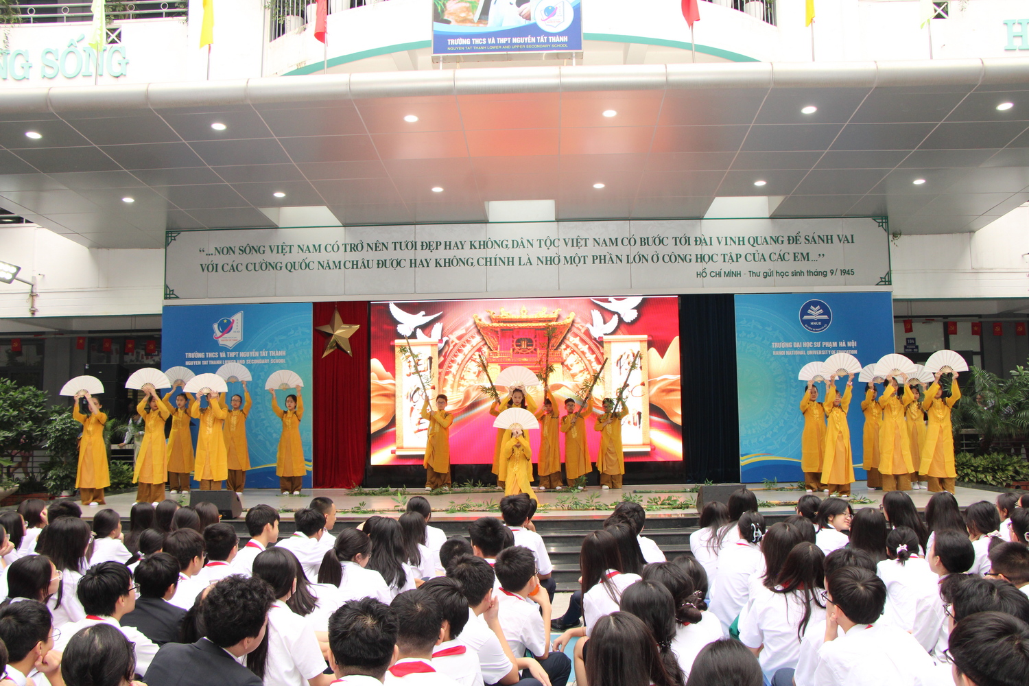Tiết mục múa của lớp 6A5 đã gợi lên vẻ đẹp của nghệ thuật thư pháp và nhấn mạnh vai trò của người thầy trong xã hội Việt Nam xưa