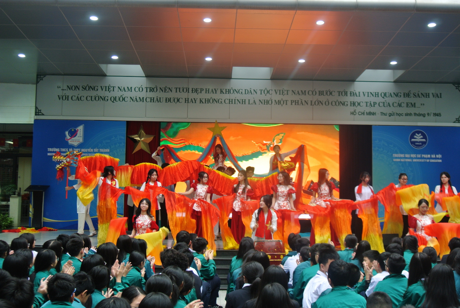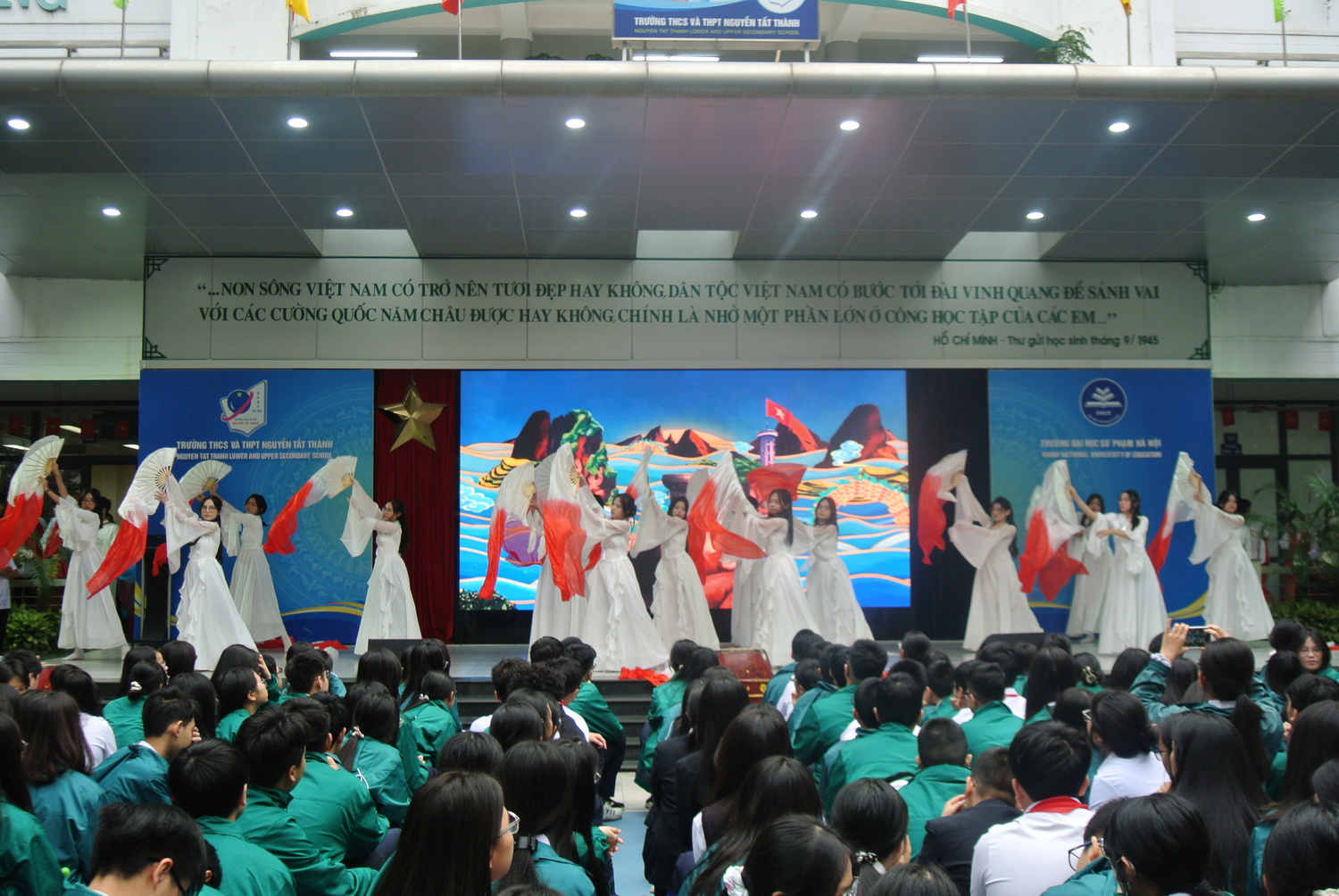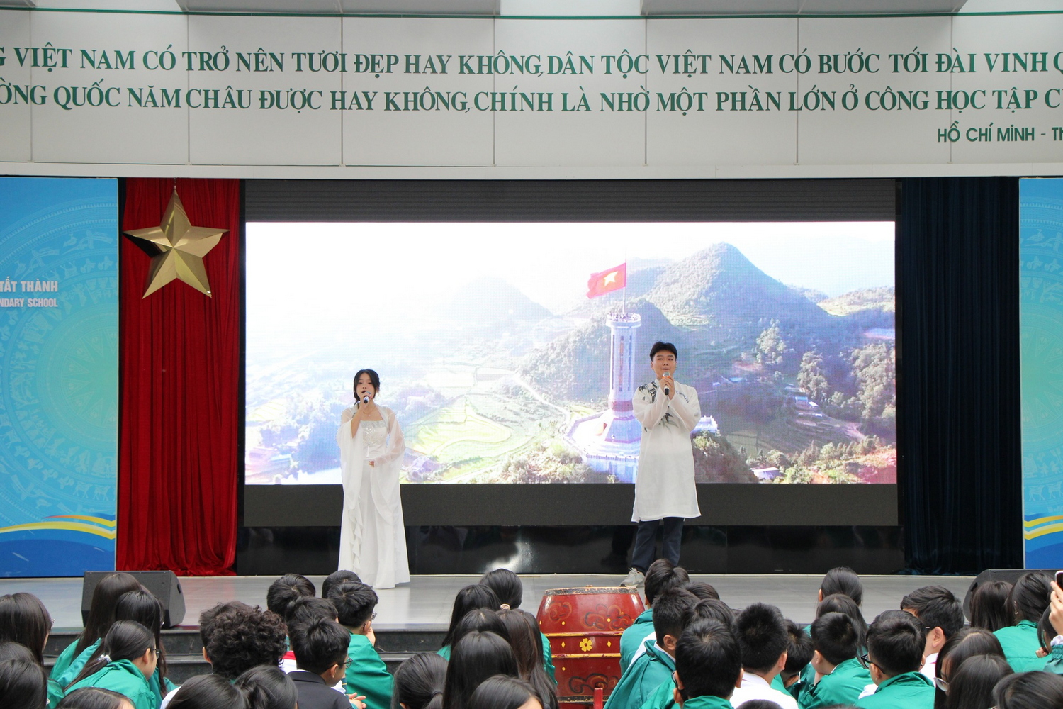 Trong dòng chảy hội nhập của thời đại mới, tình yêu quê hương và niềm tự hào dân tộc vẫn luôn là nền tảng bền vững làm nên bản sắc của mỗi con người Việt Nam. Từ lịch sử, văn hóa đến con người, mảnh đất hình chữ S mang trong mình những giá trị thiêng liêng cần được gìn giữ và tiếp nối. Với tinh thần ấy, buổi sinh hoạt dưới cờ sáng thứ Hai (15/12/2025) với chủ đề “Tự hào một dải non sông Việt Nam” do ba tập thể lớp 12A2, 12D3 và 12D5 thực hiện, đã mang đến một hành trình nghệ thuật giàu cảm xúc, khơi dậy niềm tự hào về đất nước và con người Việt Nam trong mỗi học sinh Trường THCS và THPT Nguyễn Tất Thành.