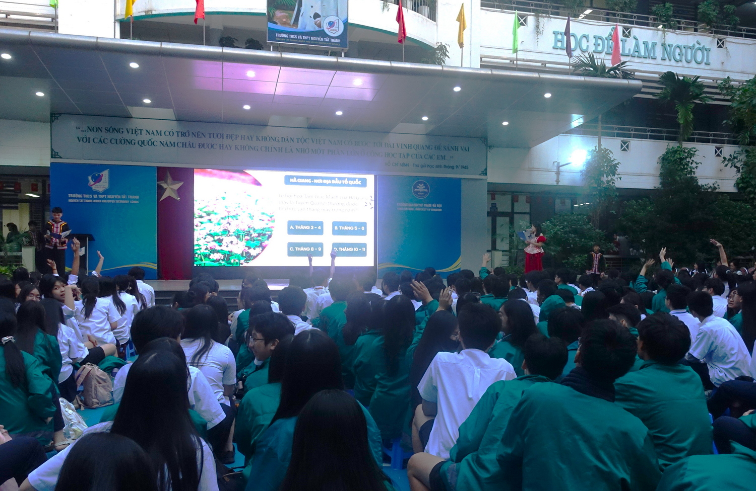 Xen kẽ các tiết mục nghệ thuật là trò chơi tương tác “Hành trình xuyên Việt - một dải non sông”. Qua những câu hỏi dẫn dắt từ Bắc vào Nam, học sinh được khám phá các địa danh tiêu biểu cùng những nét văn hóa đặc trưng của từng vùng miền. Hoạt động không chỉ bổ sung kiến thức mà còn giúp học sinh dưới mái trường mang tên Bác cảm nhận rõ hơn sự thống nhất trong đa dạng, từ đó thêm trân trọng và tự hào về quê hương, đất nước mình.