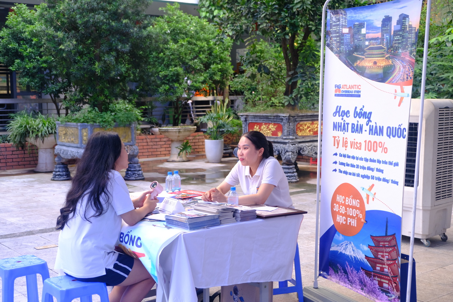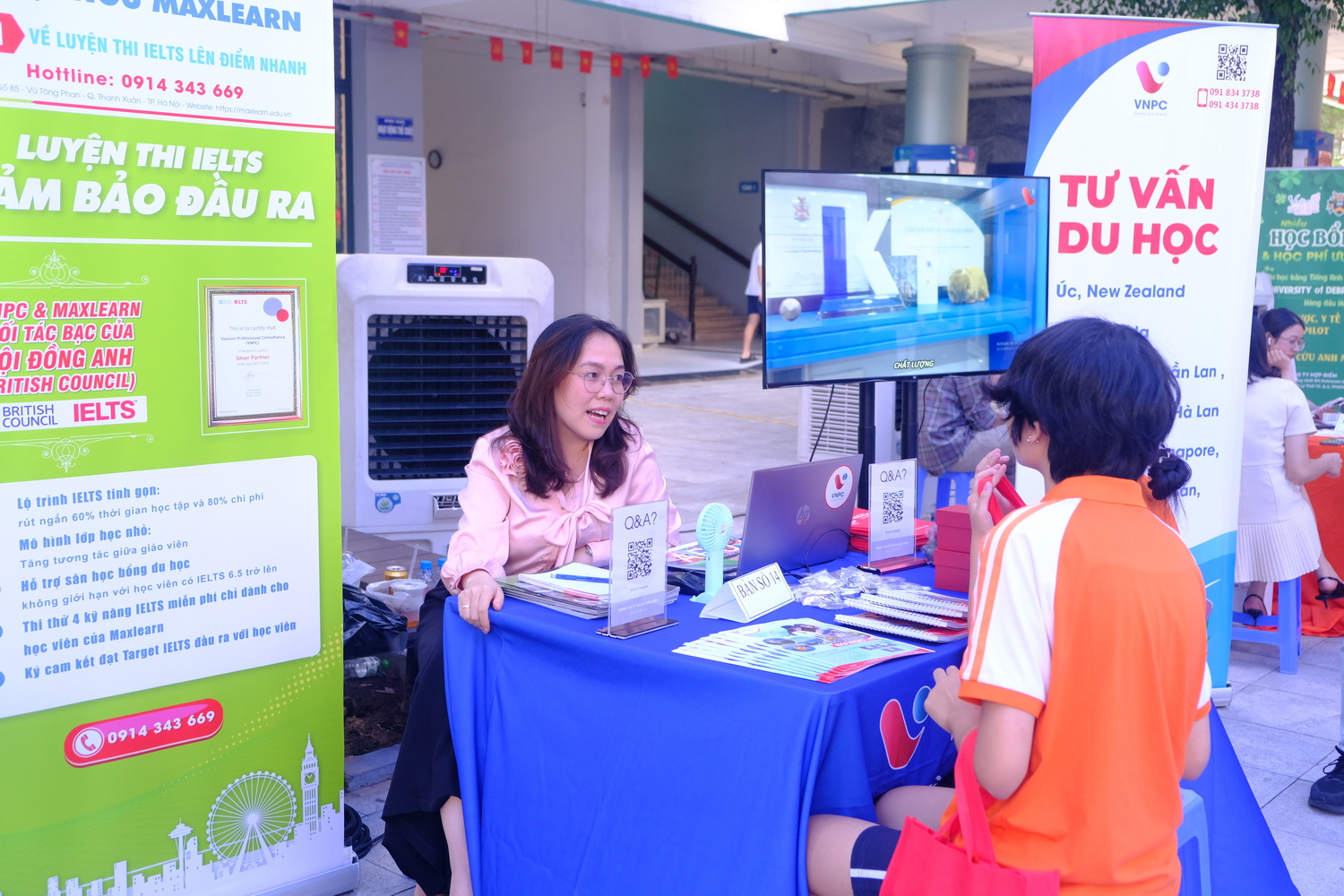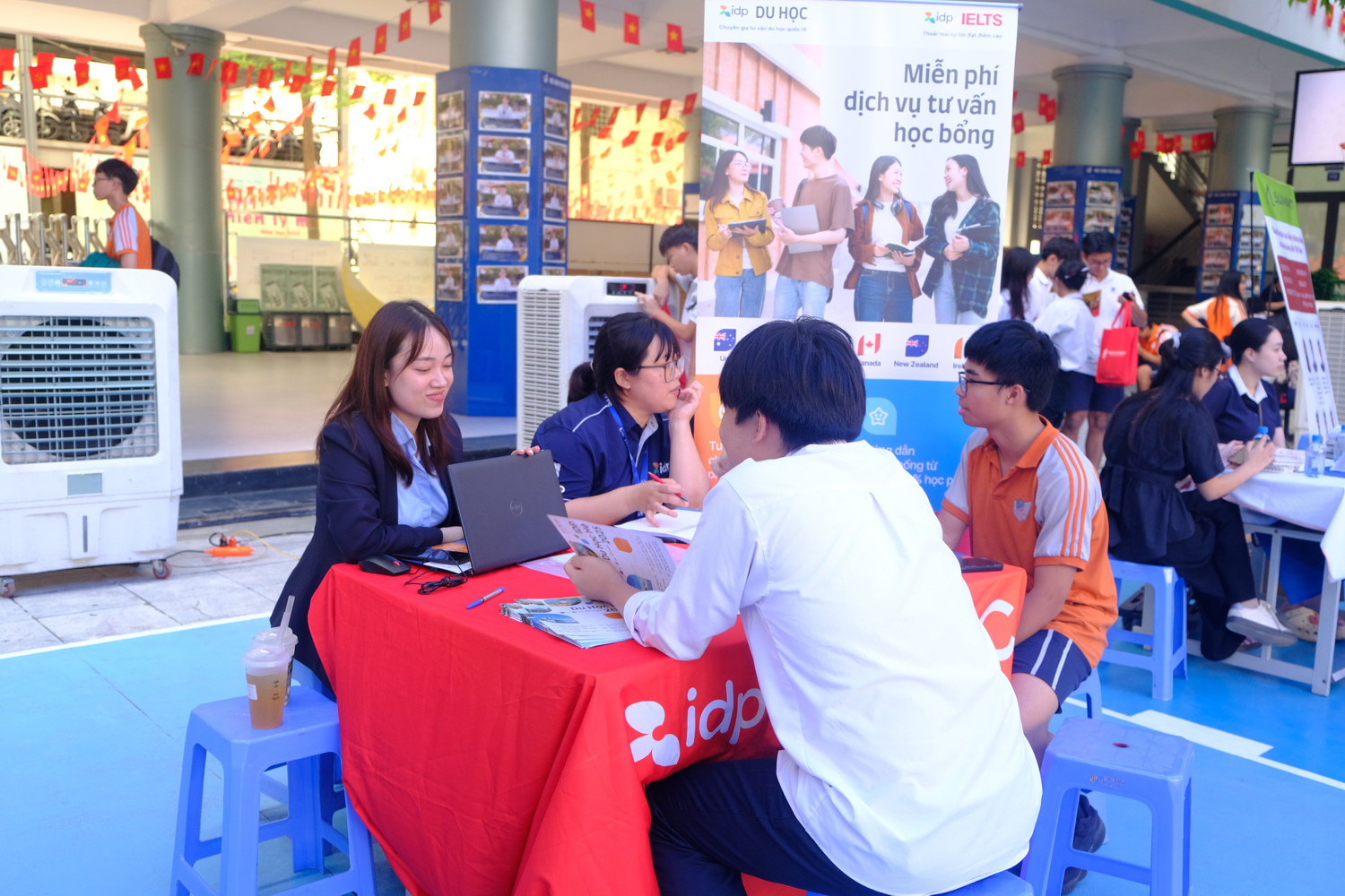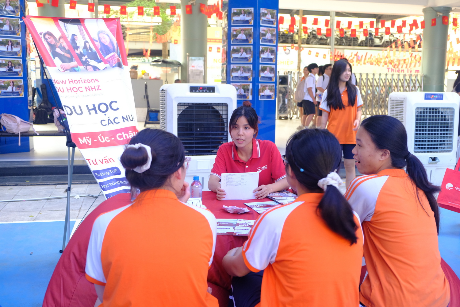 Trong cùng thời gian, học sinh khối 10 và 11 tham quan các gian tư vấn đặt tại sân trường. Không chỉ được nhận tài liệu giới thiệu, các học sinh còn có cơ hội trò chuyện trực tiếp với các đại diện đơn vị tư vấn để hiểu thêm về chương trình đào tạo, học bổng, cơ hội nghề nghiệp sau khi ra trường. Không ít học sinh bày tỏ sự háo hức khi lần đầu tiên được tiếp cận gần gũi với một “bức tranh du học” đa dạng và nhiều màu sắc đến vậy.