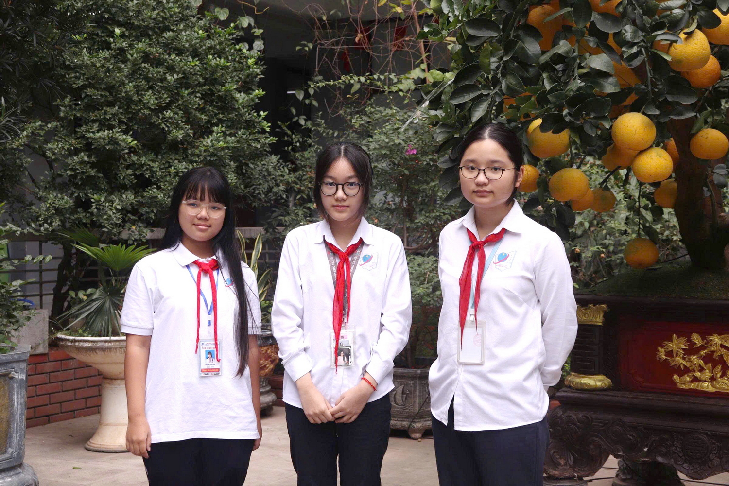 Những cô gái trẻ đầy đam mê Văn học (từ trái sang phải): Phạm Tâm Như (9A2) - giải Khuyến khích, Phạm Huyền Trang (9A4) - giải Nhì, Nguyễn Vũ Tuệ Dương (9A6) - giải Khuyến khích