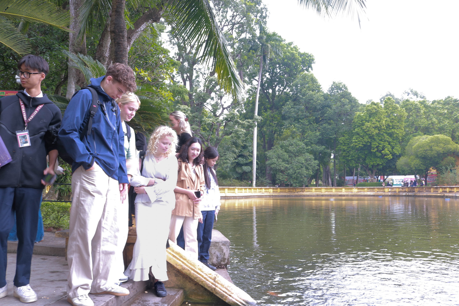 Các bạn học sinh quốc tế thích thú khi cho cá ăn tại Lăng Chủ tịch