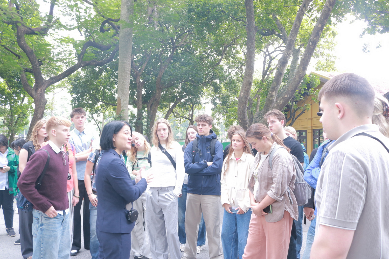 Đoàn trường Frederiksborg chăm chú lắng nghe những câu chuyện lịch sử về khu di tích Nhà Quốc hội
