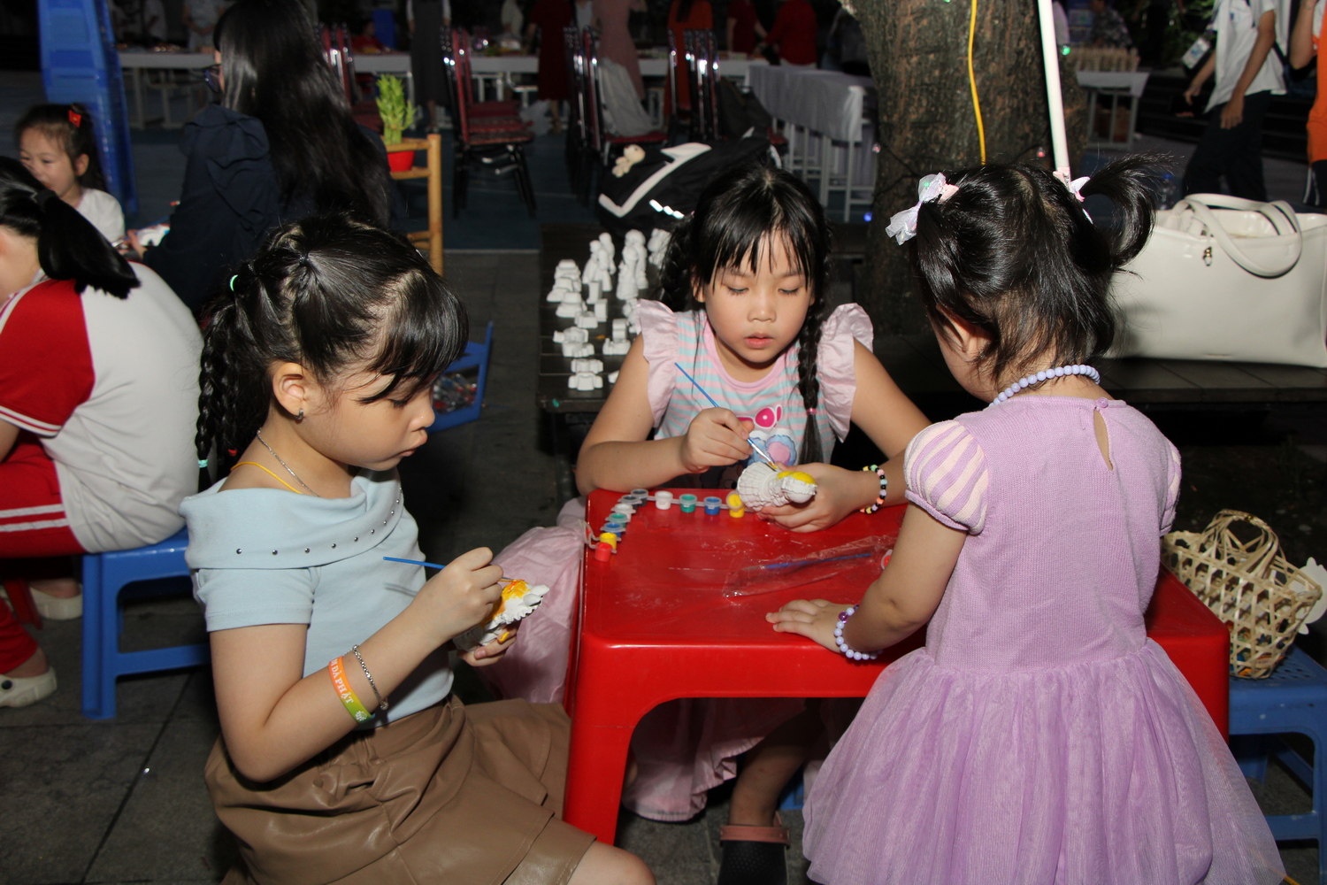 Các bé chăm chú tô màu những bức tượng mà mình yêu thích