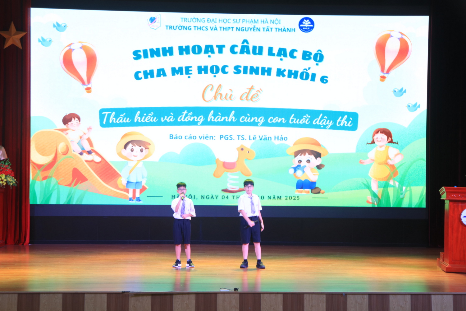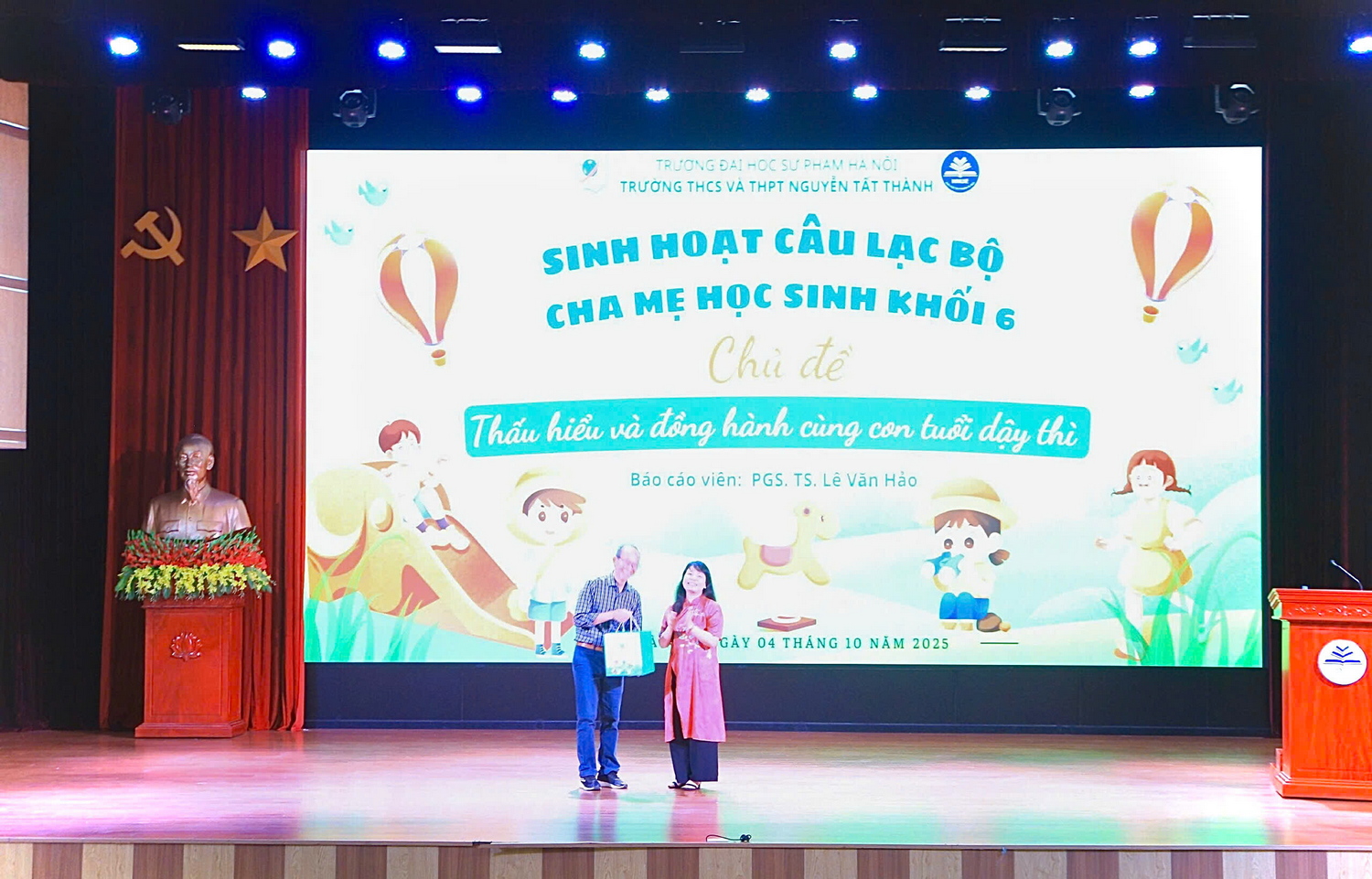 Vào sáng thứ Bảy (04/10/2025), tại Hội trường 11/10 – Trường Đại học Sư phạm Hà Nội, Trường THCS và THPT Nguyễn Tất Thành đã tổ chức buổi sinh hoạt CLB Cha mẹ học sinh khối 6 với chủ đề “Thấu hiểu và đồng hành cùng con tuổi dậy thì”. Chương trình mang đến không gian sẻ chia về sức khỏe tâm liý học sinh, giúp phụ huynh hiểu rõ hơn những thay đổi, khó khăn của con trong giai đoạn trưởng thành để đồng hành và thấu hiểu con sâu sắc hơn.