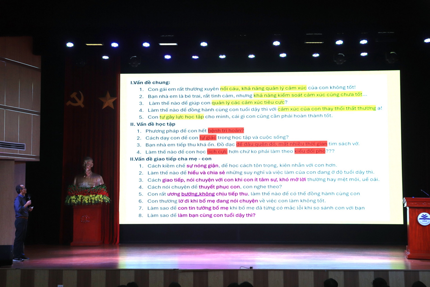 Trong phần chia sẻ, diễn giả Lê Văn Hảo đã khéo léo dẫn dắt khán phòng khám phá những đặc điểm tâm lý điển hình của lứa tuổi 12–16: thường khát khao tự lập, đồng thời dễ thay đổi cảm xúc và nhạy cảm trước những đánh giá từ cha mẹ, trong khi đó phụ huynh lại thường lo lắng, bảo vệ thái quá hoặc thiếu sự lắng nghe, khiến khoảng cách thế hệ càng lớn dần. Trước những biến đổi ấy, diễn giả nhấn mạnh: “Muốn con thay đổi, cha mẹ cần bắt đầu từ chính mình.” Việc lắng nghe, thấu hiểu cảm xúc của con, tôn trọng sự khác biệt và hướng dẫn bằng tình yêu thương chính là chìa khóa giúp cha mẹ và con cái tìm lại sự kết nối.