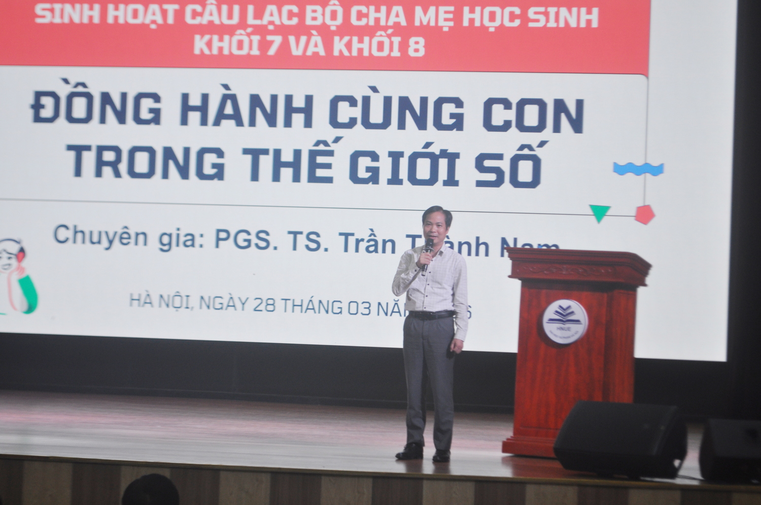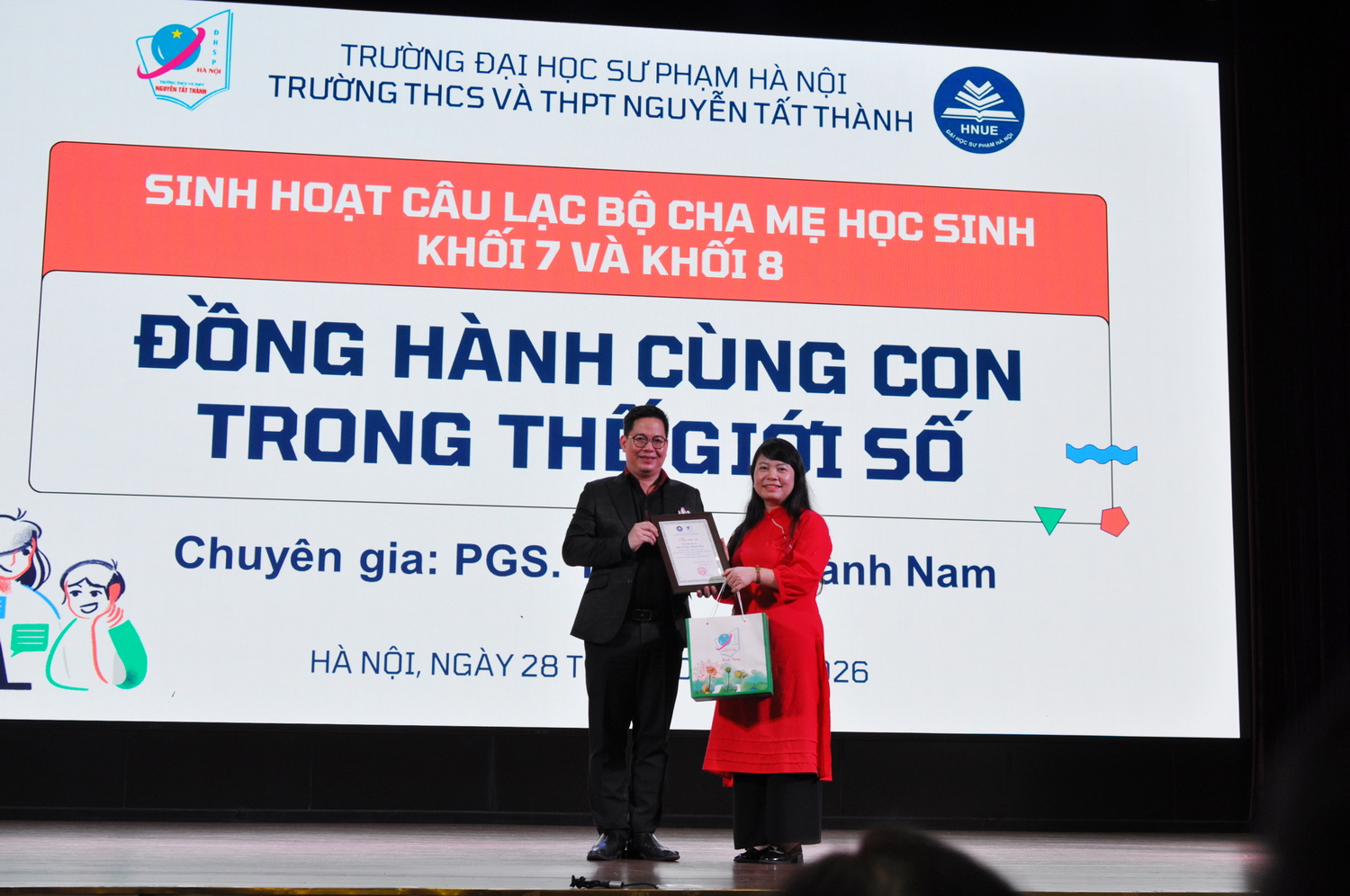 Trong thời đại số ngày nay, sự phát triển vượt bậc của mạng xã hội và Internet đã kéo nhiều hệ luỵ khôn lường, nhất là đối với giới trẻ. Nắm bắt được điều đó, ngày 28/3/2026, với sự đồng hành của PGS. TS. Trần Thành Nam - Phó Hiệu trưởng Trường Đại học Giáo dục (Đại học Quốc gia Hà Nội), chuyên gia Tâm lí học đường, Trường THCS và THPT Nguyễn Tất Thành đã tổ chức buổi sinh hoạt CLB Cha mẹ học sinh (CMHS) khối 7, 8 với chủ đề “Đồng hành cùng con trong thế giới số” nhằm giúp phụ huynh tìm hiểu và nâng cao kĩ năng phòng ngừa những vấn nạn đang hiện hữu trên không gian mạng cho con trẻ.