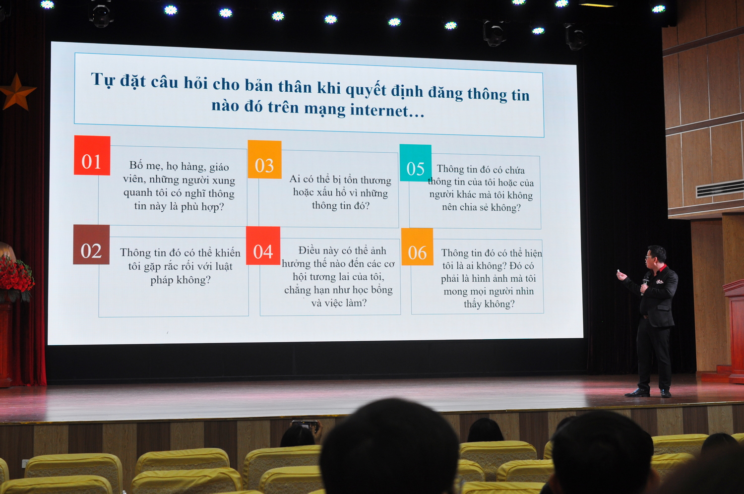 Qua những câu chuyện, những số liệu thực tế, PGS.TS. Trần Thành Nam chỉ rõ thực trạng đáng quan tâm trong xã hội. Hiện nay, học sinh ngày càng tiếp xúc nhiều với không gian mạng nhưng chưa được trang bị đầy đủ kĩ năng tự bảo vệ. Các em có thể đối mặt với nhiều nguy cơ như bị lừa đảo, xâm phạm quyền riêng tư, tiếp cận thông tin sai lệch hoặc bị bắt nạt trực tuyến. Nếu không được định hướng đúng, những tác động tiêu cực này có thể ảnh hưởng lâu dài đến tâm lí và sự phát triển của học sinh.