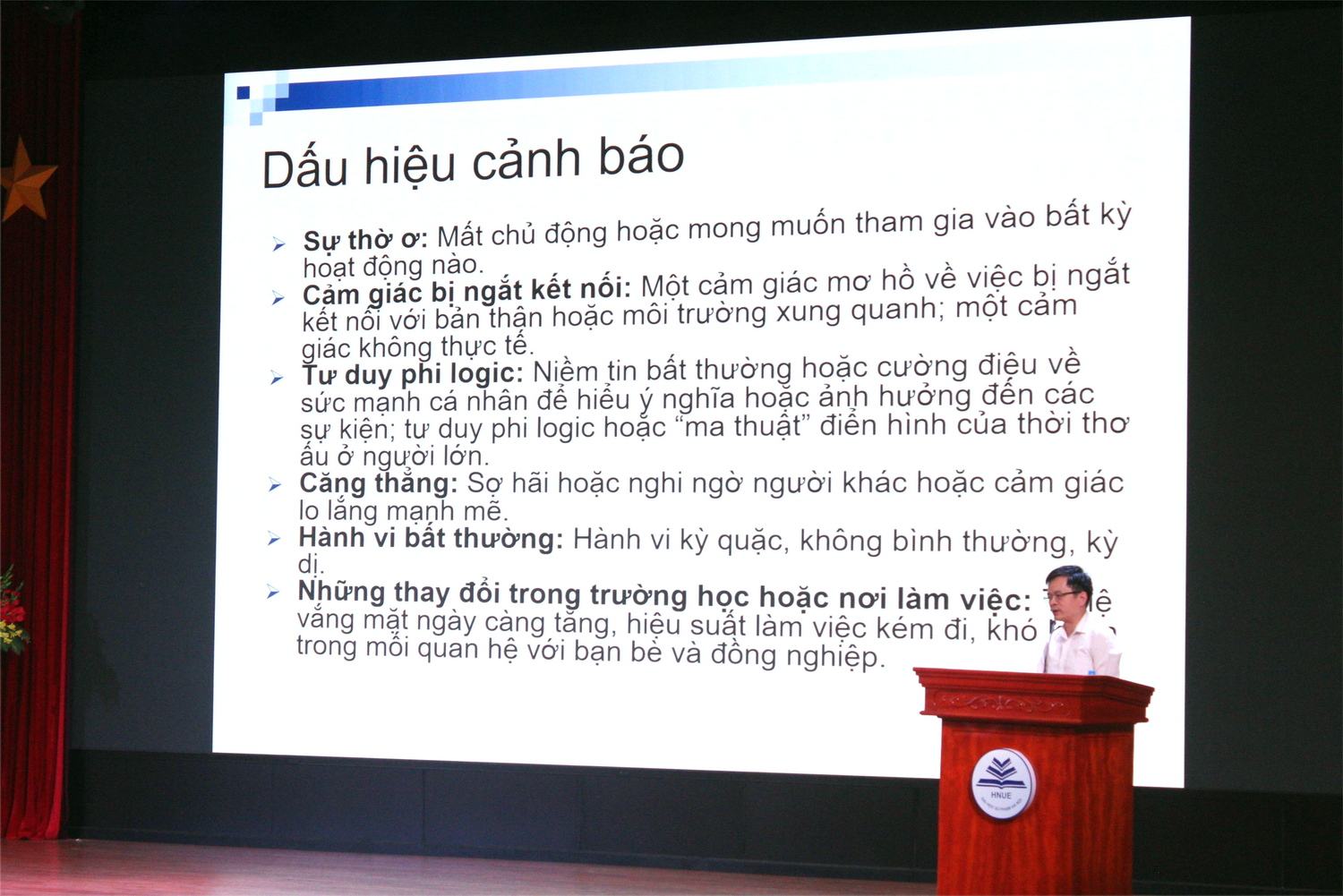 Trong phần chia sẻ, diễn giả Lê Công Thiện bóc tách từng khía cạnh của cụm từ “vấn đề tâm lý” qua các phần: Định nghĩa Sức khỏe tâm thần và Bệnh tâm thần; Các tỉ lệ hiện trạng (Dịch tễ học); Stress; Dấu hiệu cảnh báo; Một số vấn đề sức khỏe tâm thần có thể gặp ở học sinh.