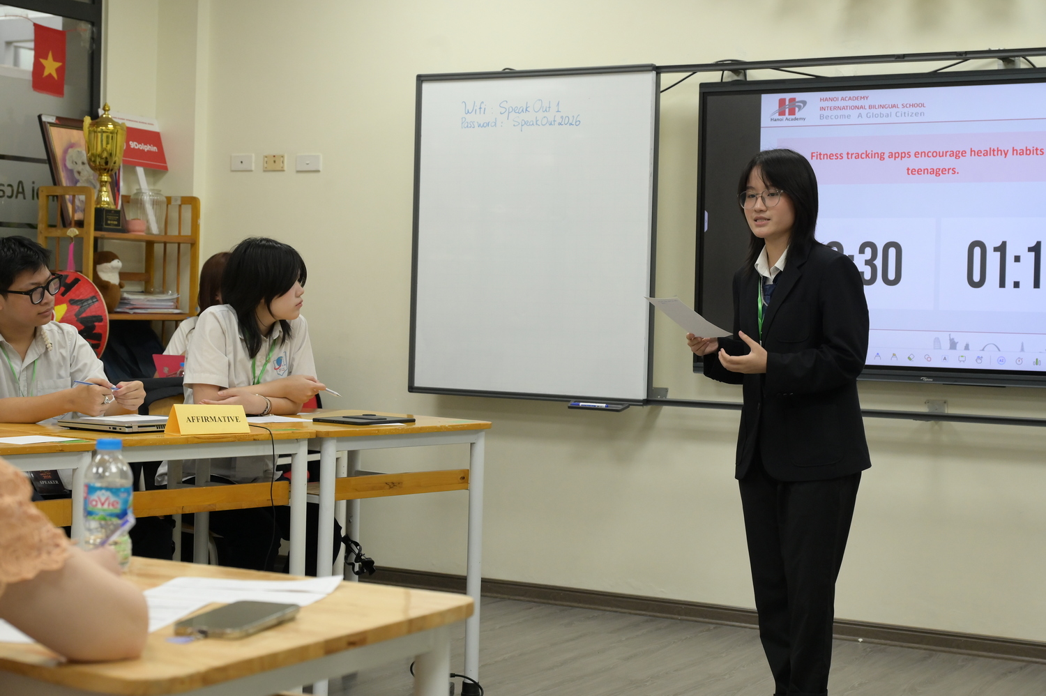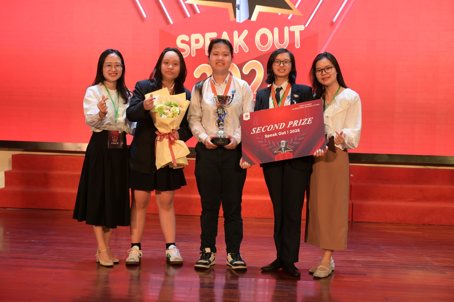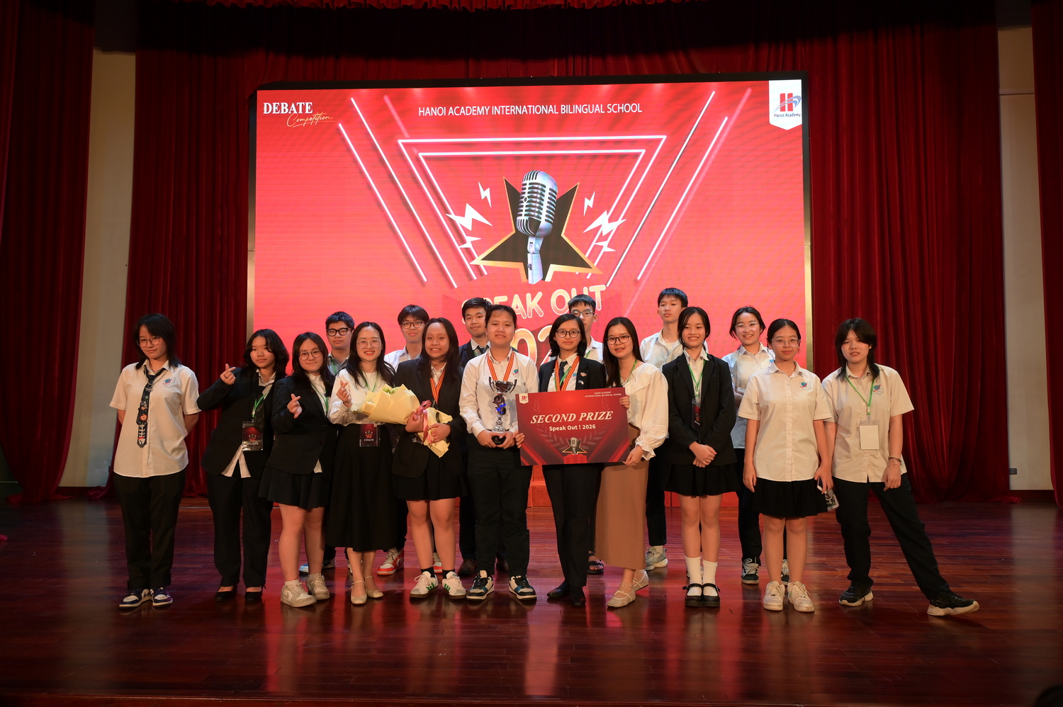 Sau nhiều nỗ lực cố gắng, những “ngôi sao tài năng” của mái trường mang tên Bác đã lộ diện: Vũ Bảo Ngọc (9A2), Nguyễn Lan My (9A4) và Hà Thái Bảo (7A5) đã bước xa hơn với đề bài thi đấu vòng chung kết: Social media companies should be responsible for the well-being of their teenage users. Cuối cùng, dưới góc nhìn của phe Phản đối, đội thi đấu của ba học sinh xuất sắc đã vinh dự đem về giải Nhì. Trong đó, học sinh Vũ Bảo Ngọc (9A2) đạt giải “Best Speaker” cuộc thi năm nay. Đáng nói, đây là lần thứ hai Bảo Ngọc giành về giải thưởng danh giá này cho bản thân.