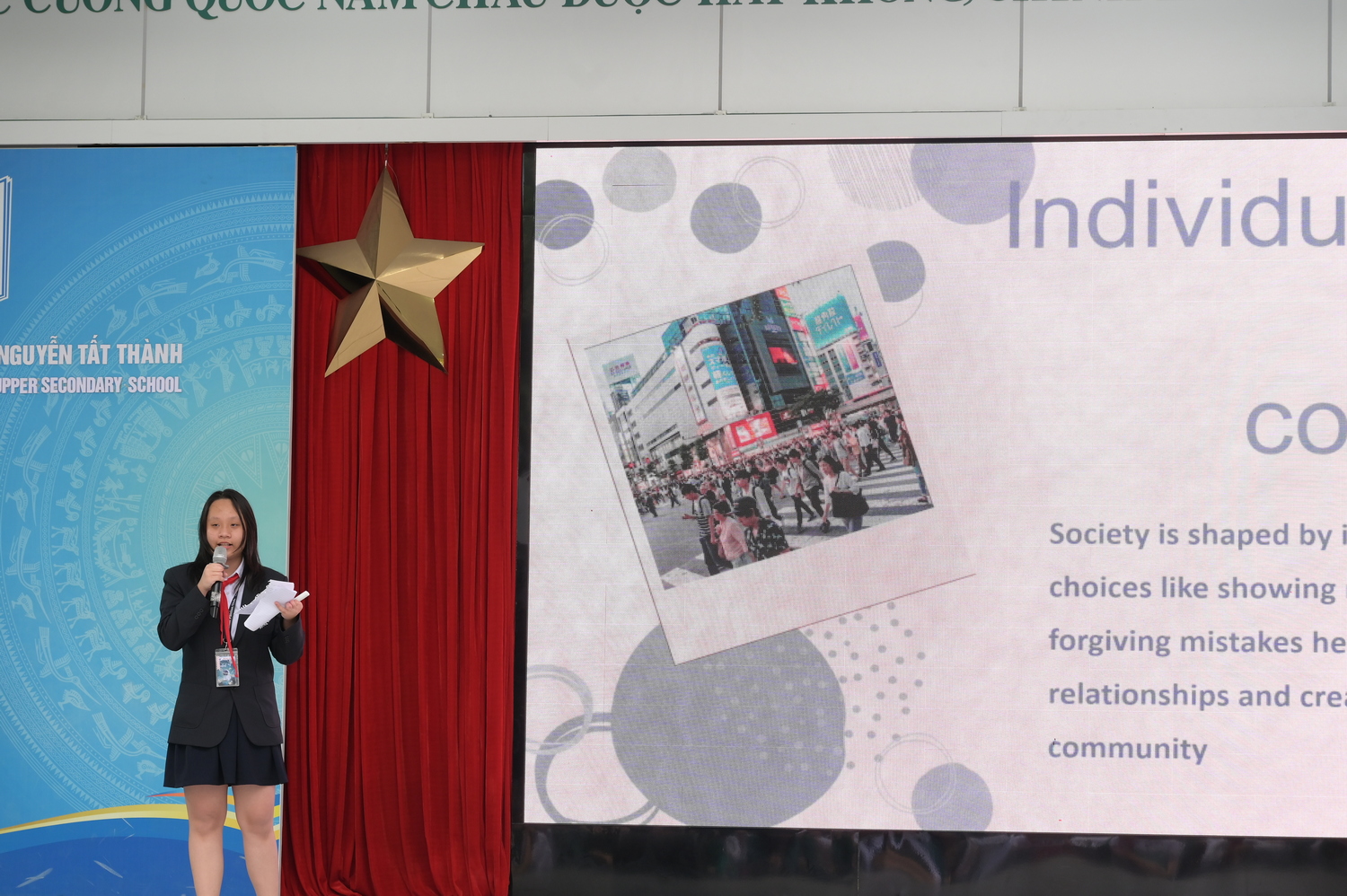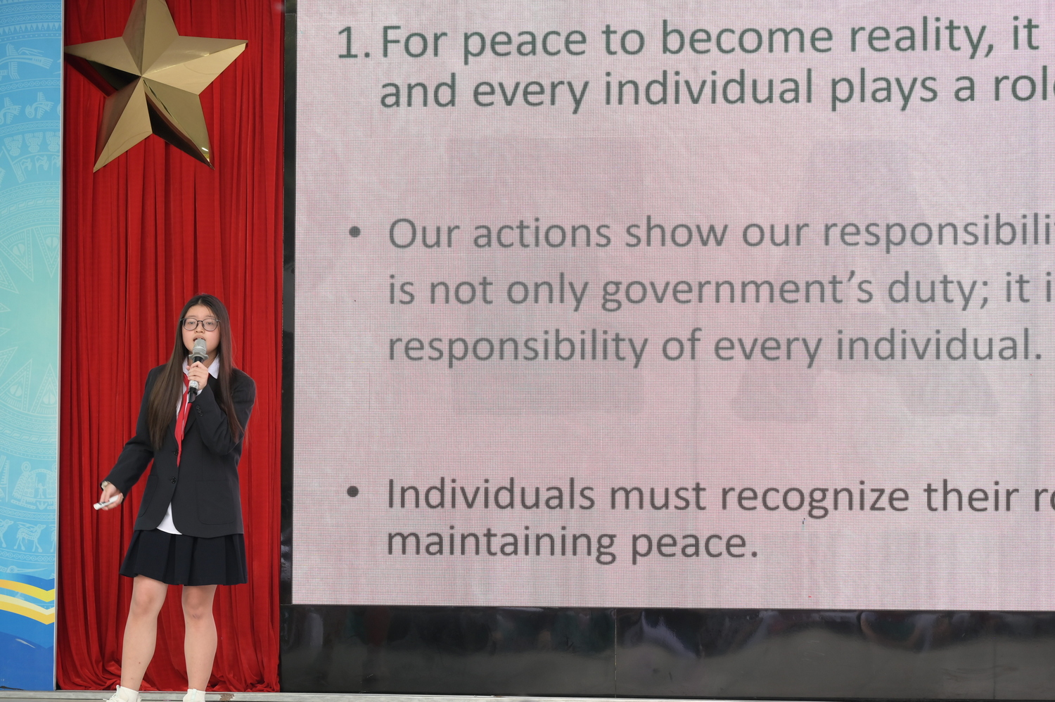 Bằng việc định nghĩa hòa bình không phải là một đặc ân để mơ mộng mà là một trách nhiệm phải gánh vác, Nguyễn Ngọc Bảo Trân (8A3) đã mang đến sự chuyển biến lớn trong nhận thức: hòa bình cần hành động, không chỉ là lời nói