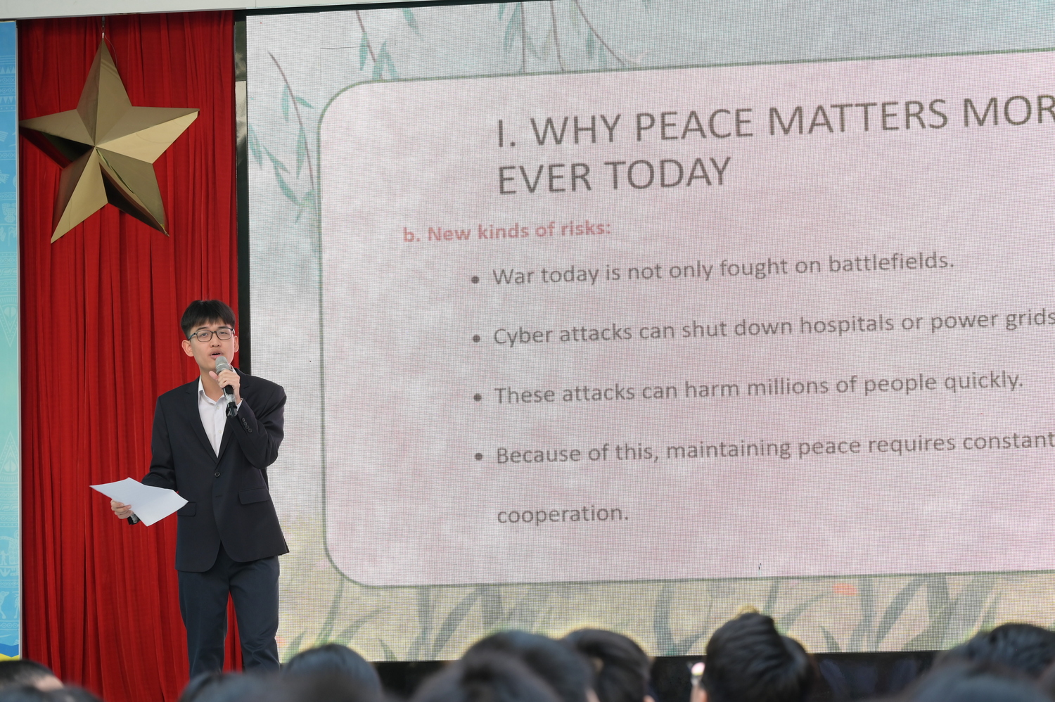 Lê Huy Khôi (10A1) đã mang đến một góc nhìn đầy thực tế về trách nhiệm bảo vệ “di sản” hòa bình của thế hệ trẻ