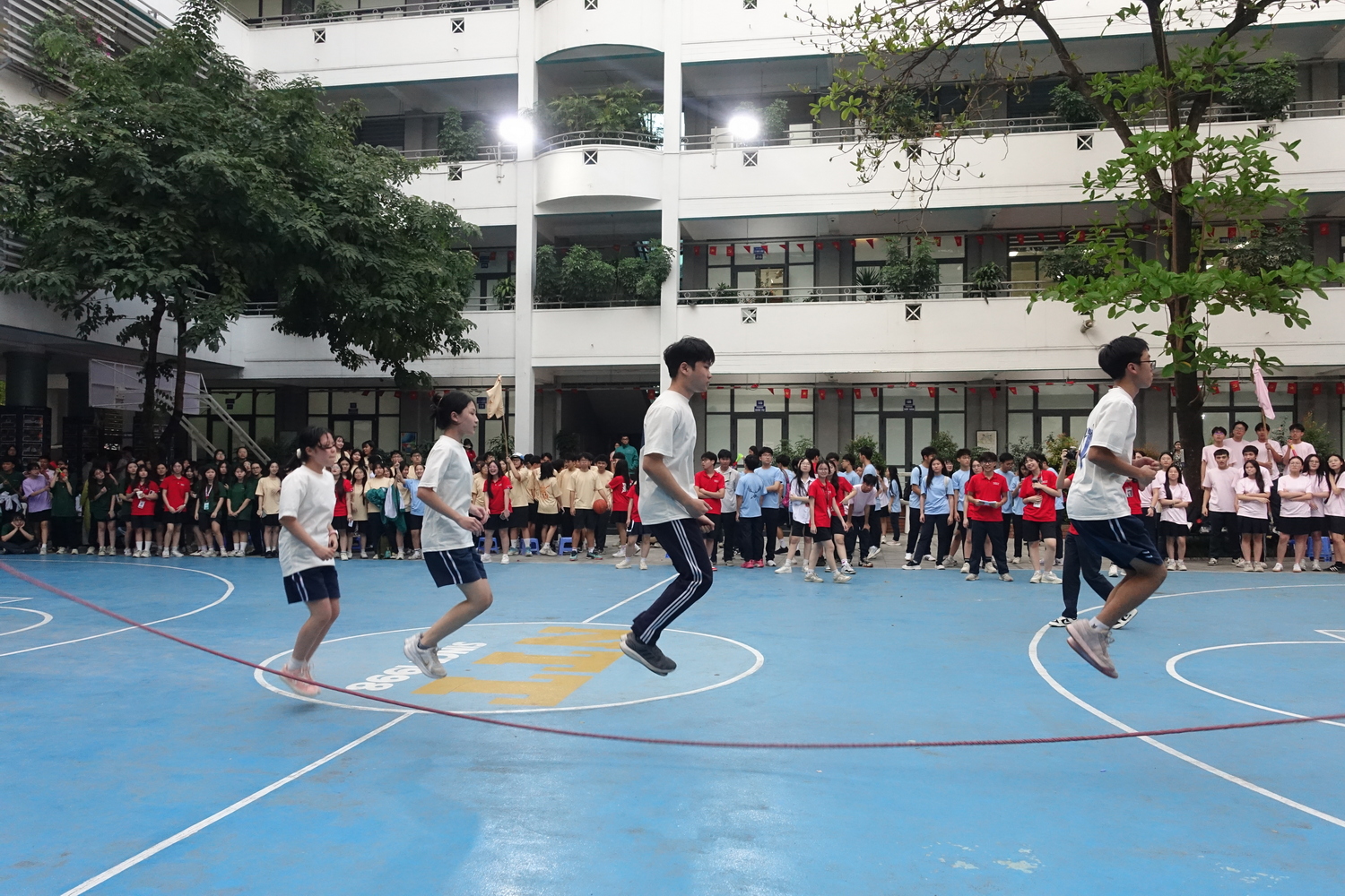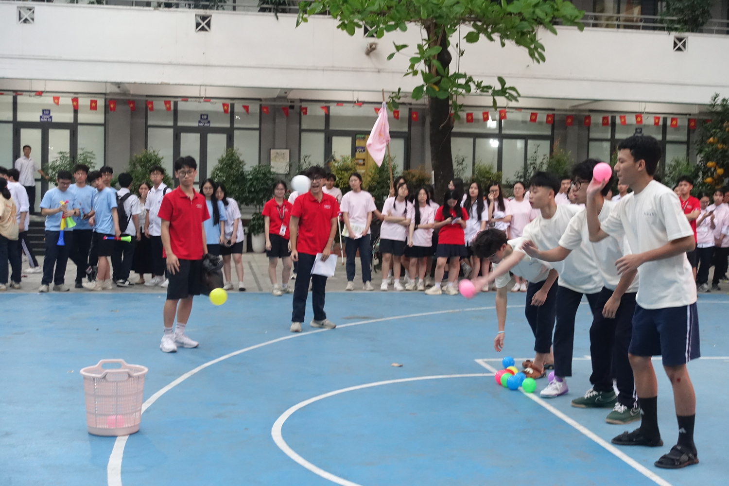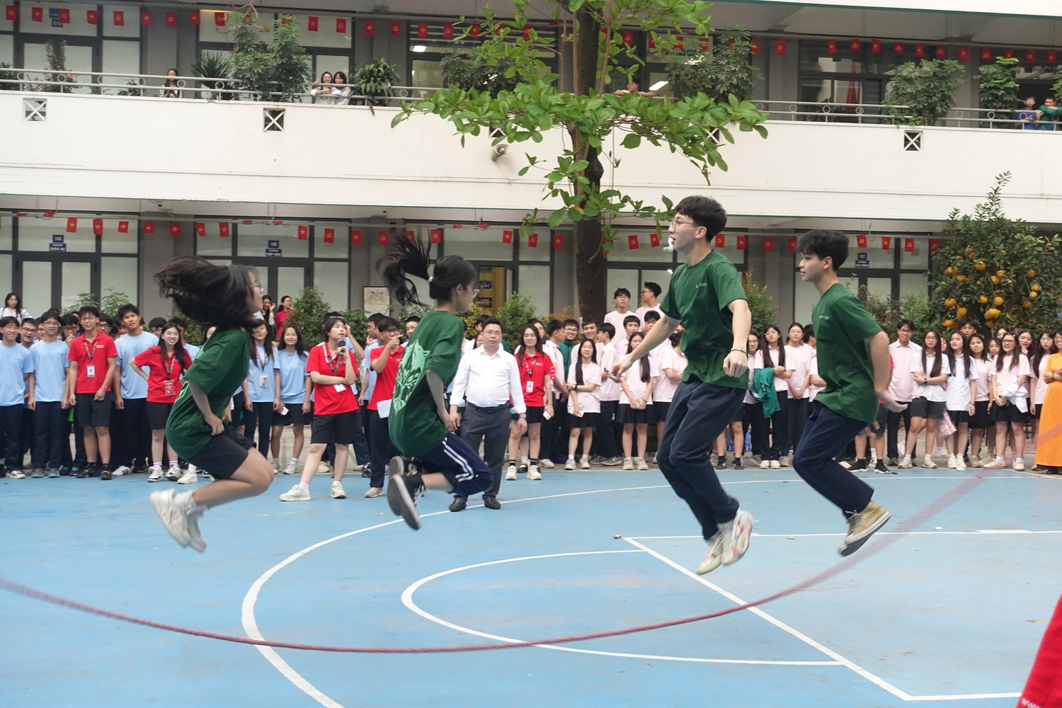 Ngay sau nghi thức rước trượng, sân trường nhanh chóng trở thành “chảo lửa” với chuỗi hoạt động thể thao tập thể.