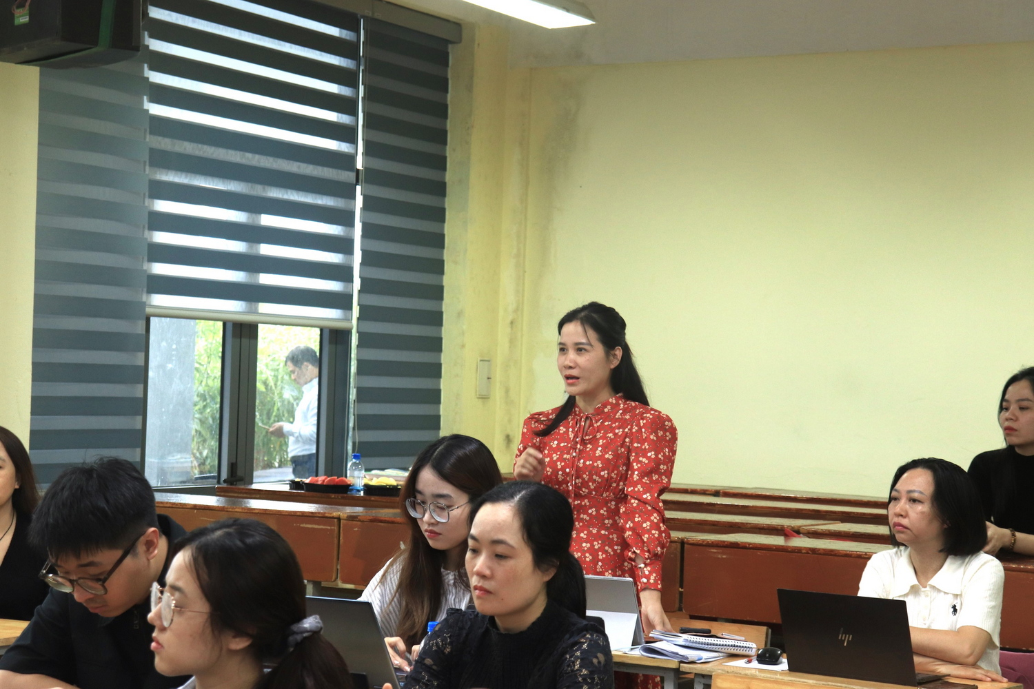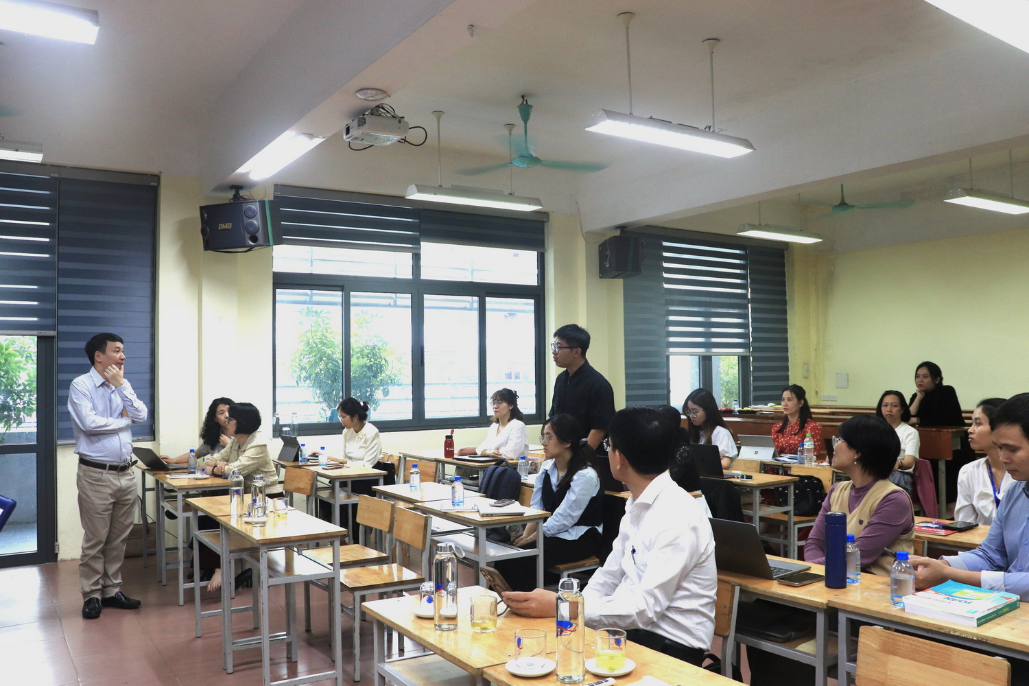 Sau phần chia sẻ của diễn giả, các thầy cô đã tích cực đặt câu hỏi và trao đổi, thảo luận các phương pháp giảng dạy và kiểm tra đánh giá. Nhiều câu hỏi xoay quanh cách xây dựng bài toán thực tiễn, xử lí tình huống hoặc cách thiết kế các tiêu chí đánh giá đã được nêu ra.