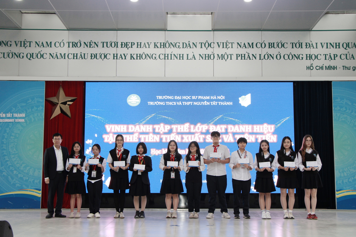 Tại buổi lễ, Nhà trường đã vinh danh các tập thể lớp đạt danh hiệu “Tập thể Tiên tiến Xuất sắc” và “Tập thể Tiên tiến” trong học kì I. Đây là sự ghi nhận xứng đáng dành cho những tập thể lớp đã thể hiện tinh thần đoàn kết, ý thức kỉ luật tốt và nỗ lực không ngừng trong học tập cũng như các hoạt động chung của trường. Danh hiệu không chỉ phản ánh kết quả học tập mà còn cho thấy sự cố gắng của cả tập thể trong việc xây dựng môi trường học đường tích cực, thân thiện và trách nhiệm.